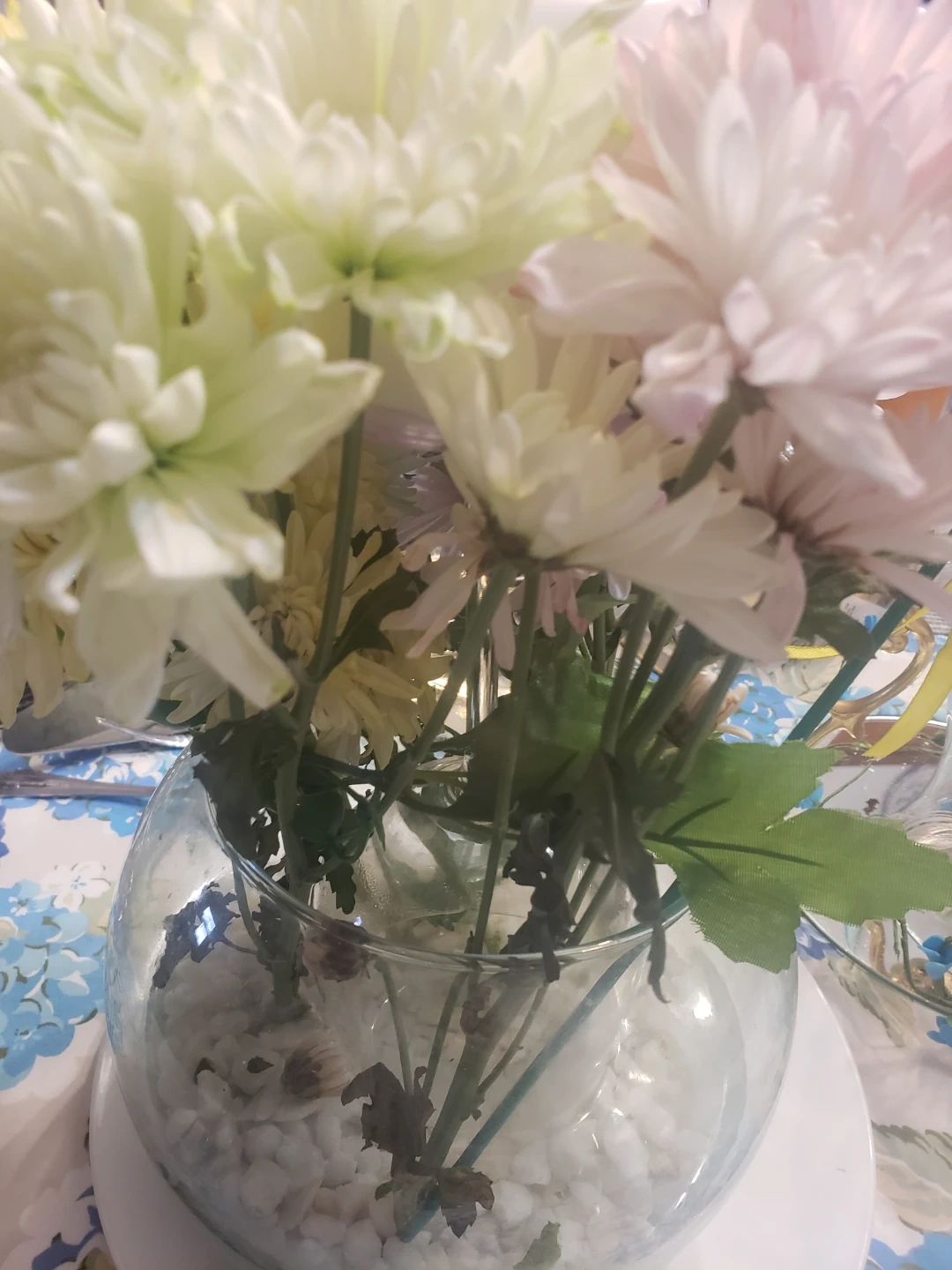 A clear glass vase filled with decorative white stones and a cluster of colourful artificial chrysanthemums. It also includes a white pillar candle nestled in the centre of the flowers. This arrangement adds a touch of colour and style to any room.