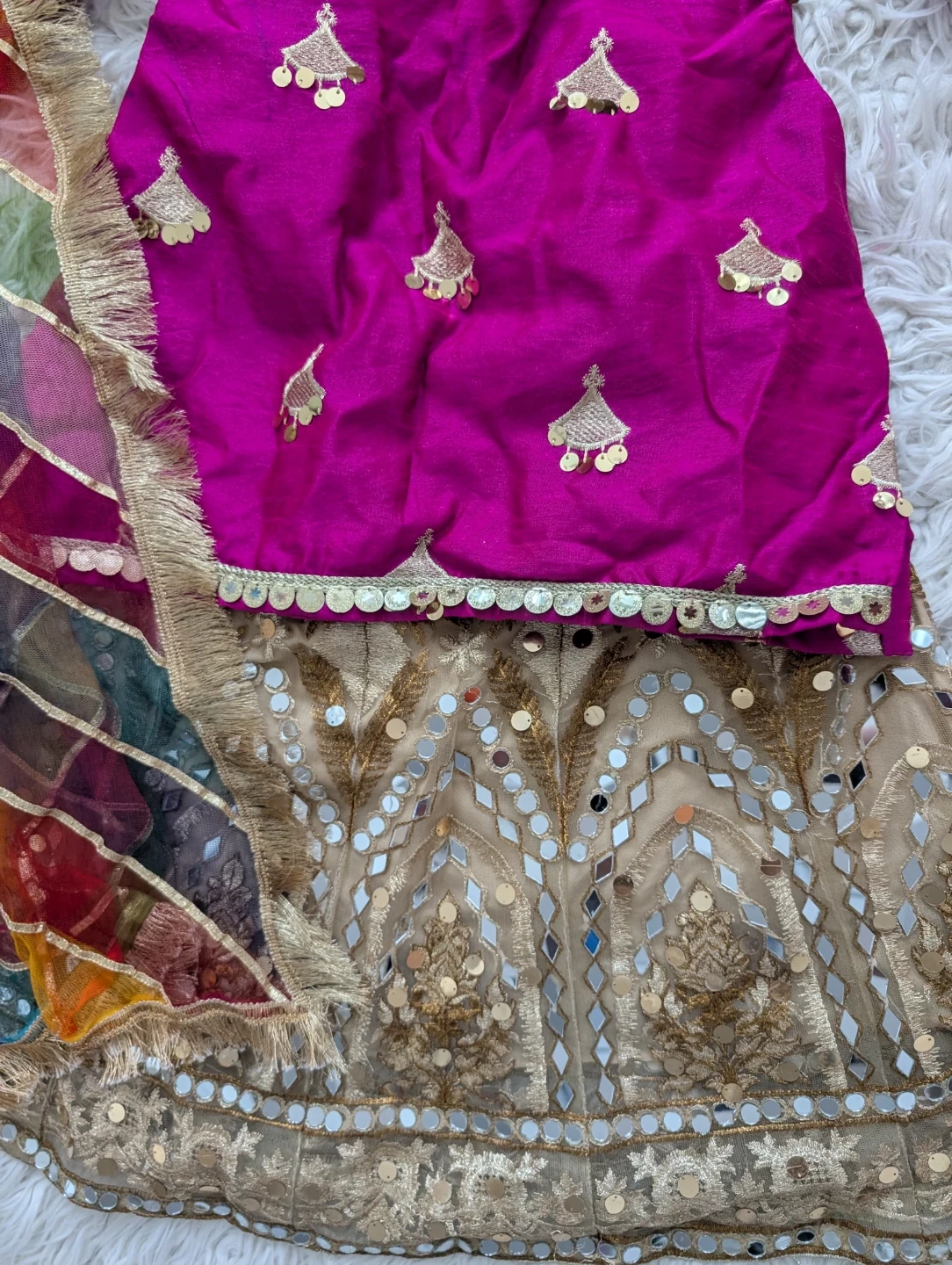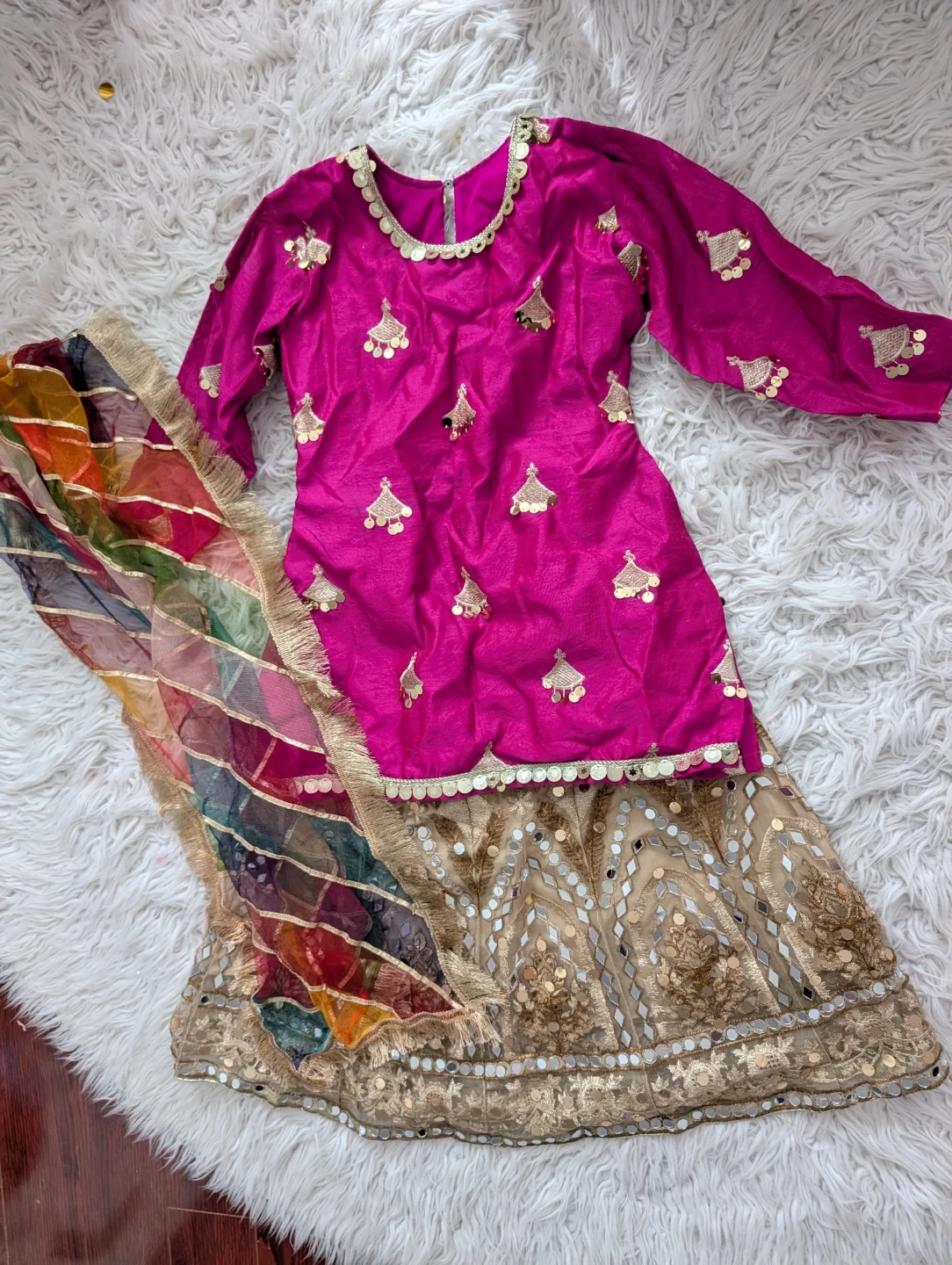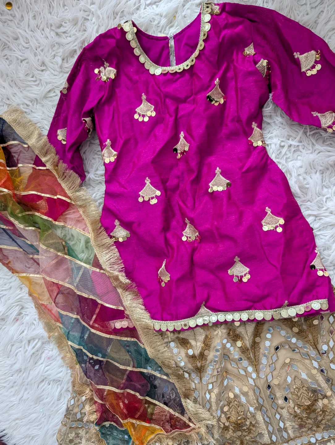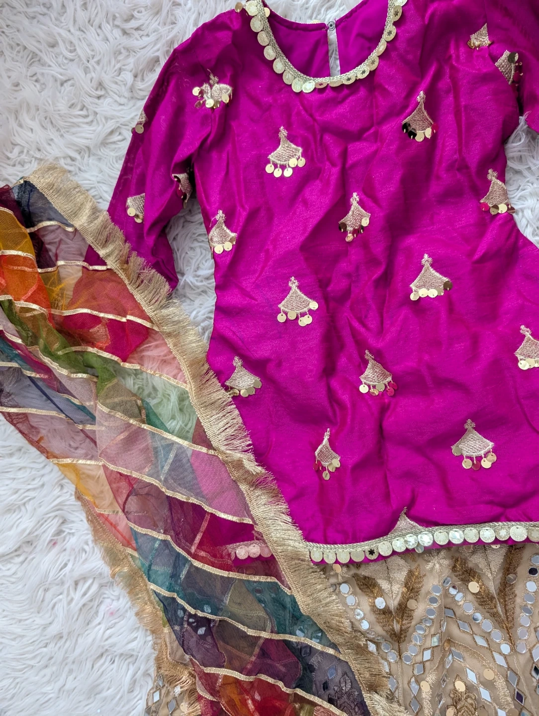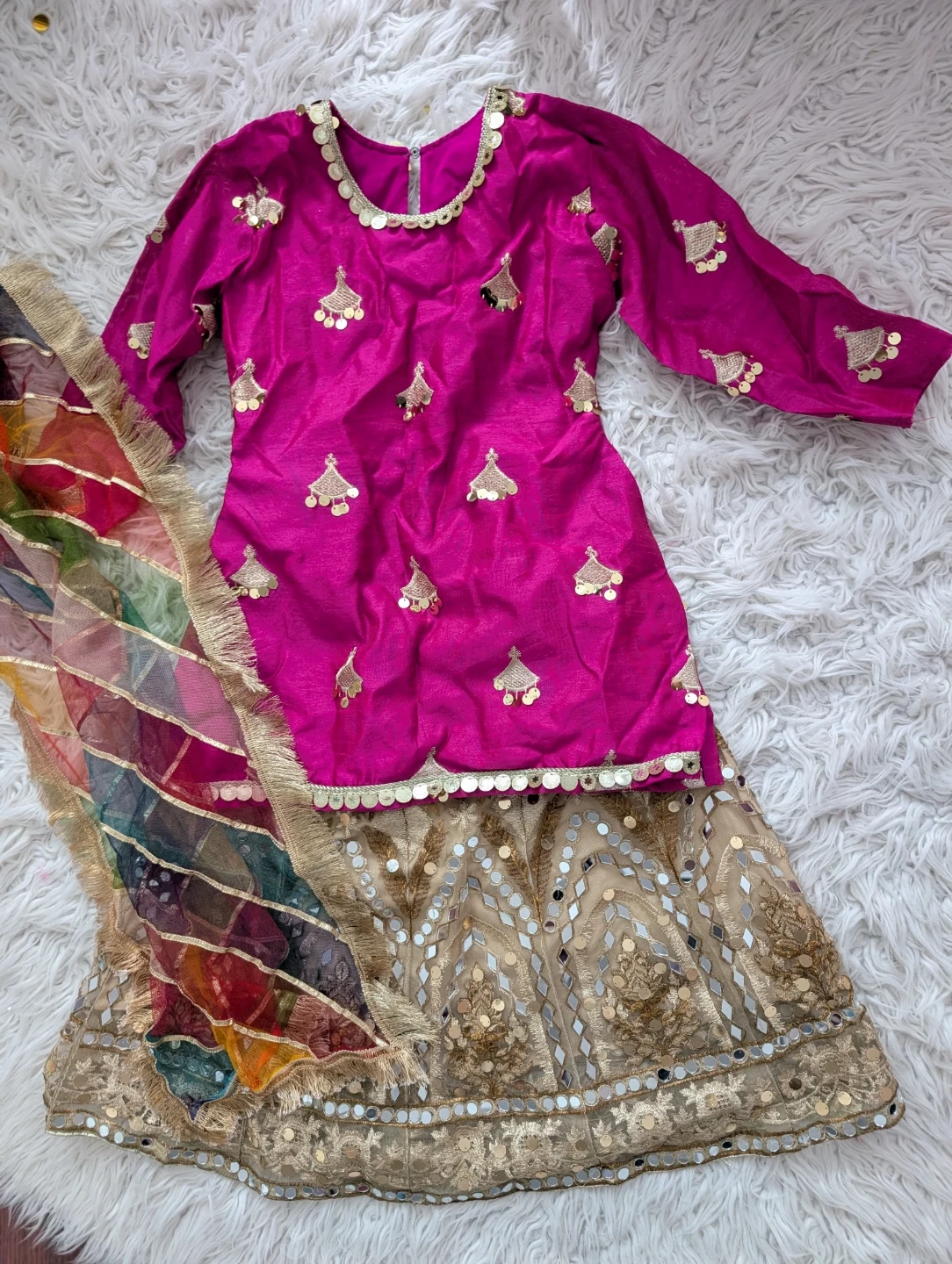 A beautiful fuchsia kurti set for girls. It features intricate gold embellishments on the kurti and a matching skirt adorned with mirrors and gold embroidery. Comes with a vibrant, multi-colored dupatta.