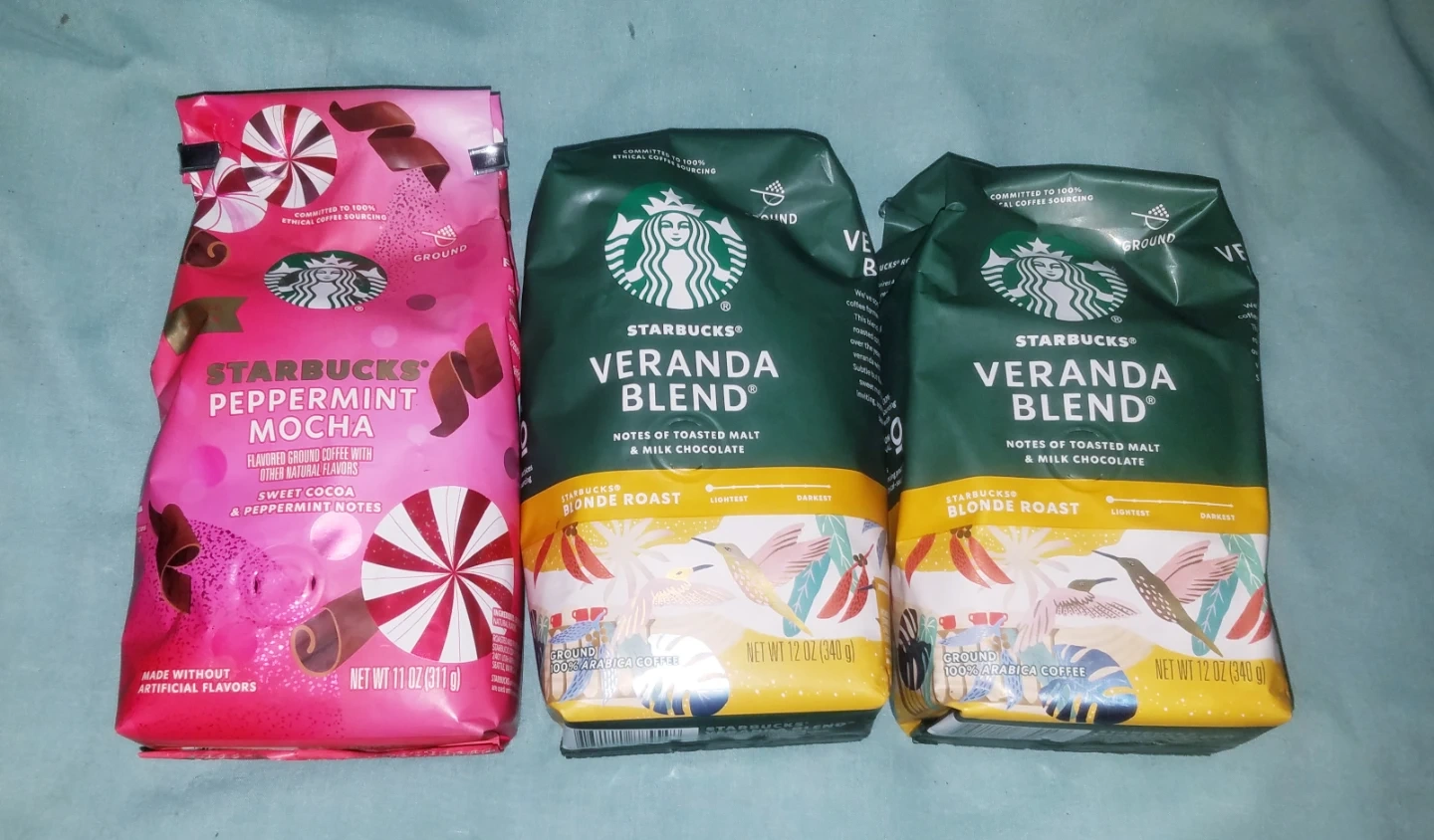 2 Starbucks Veranda Blend Blonde Roast Coffee +Peppermint Mocha