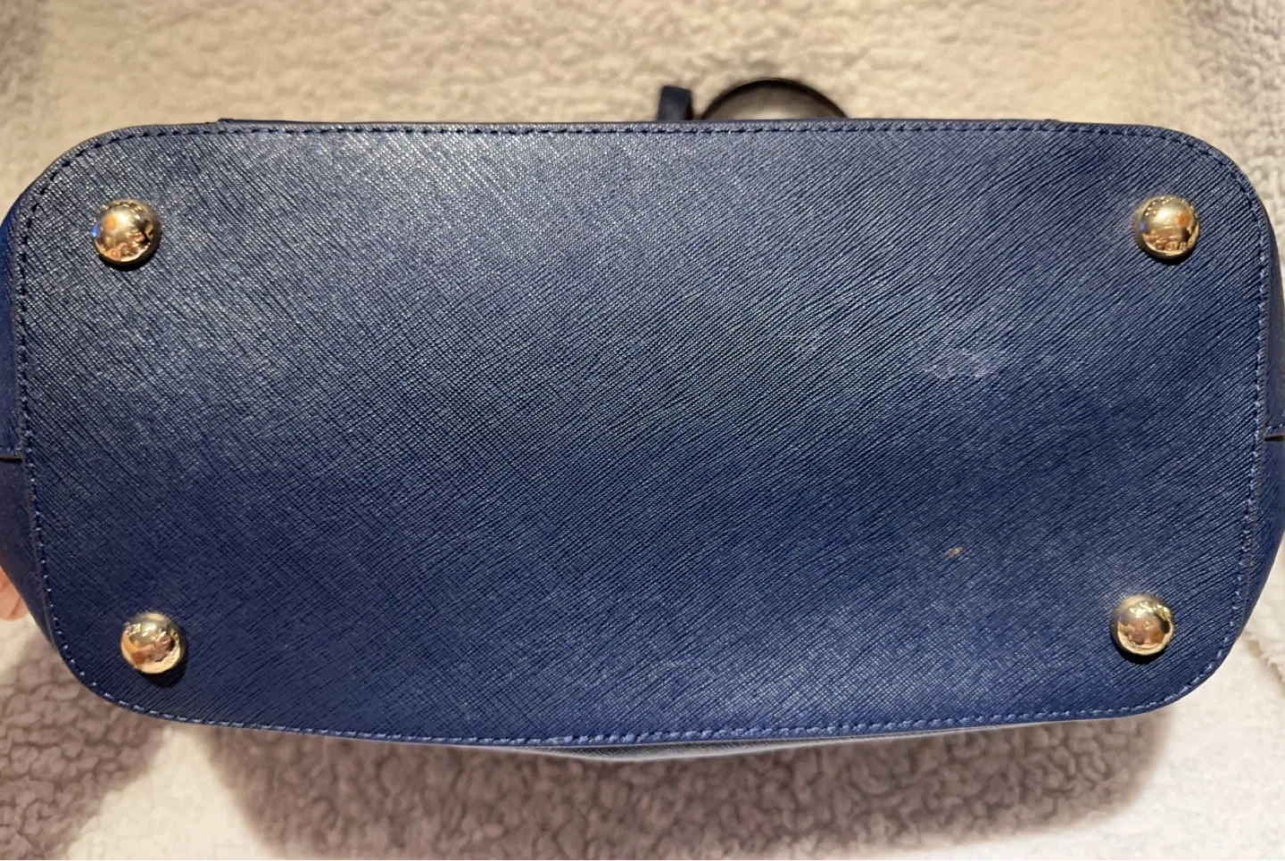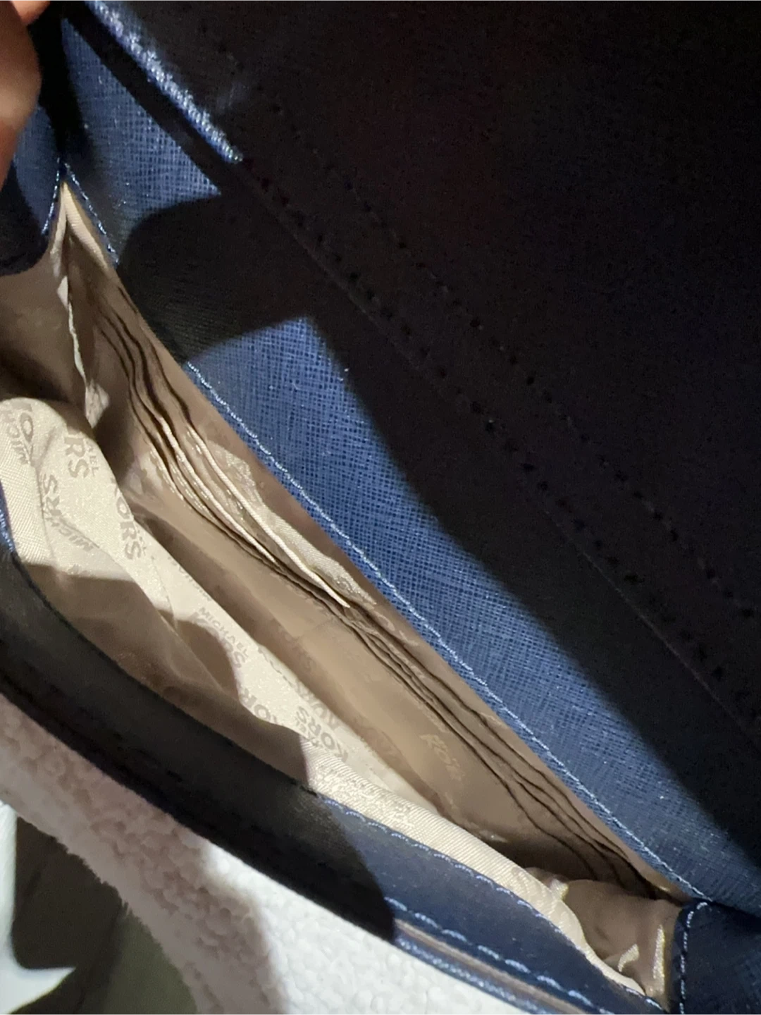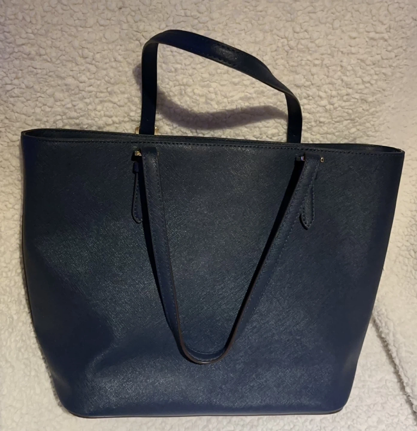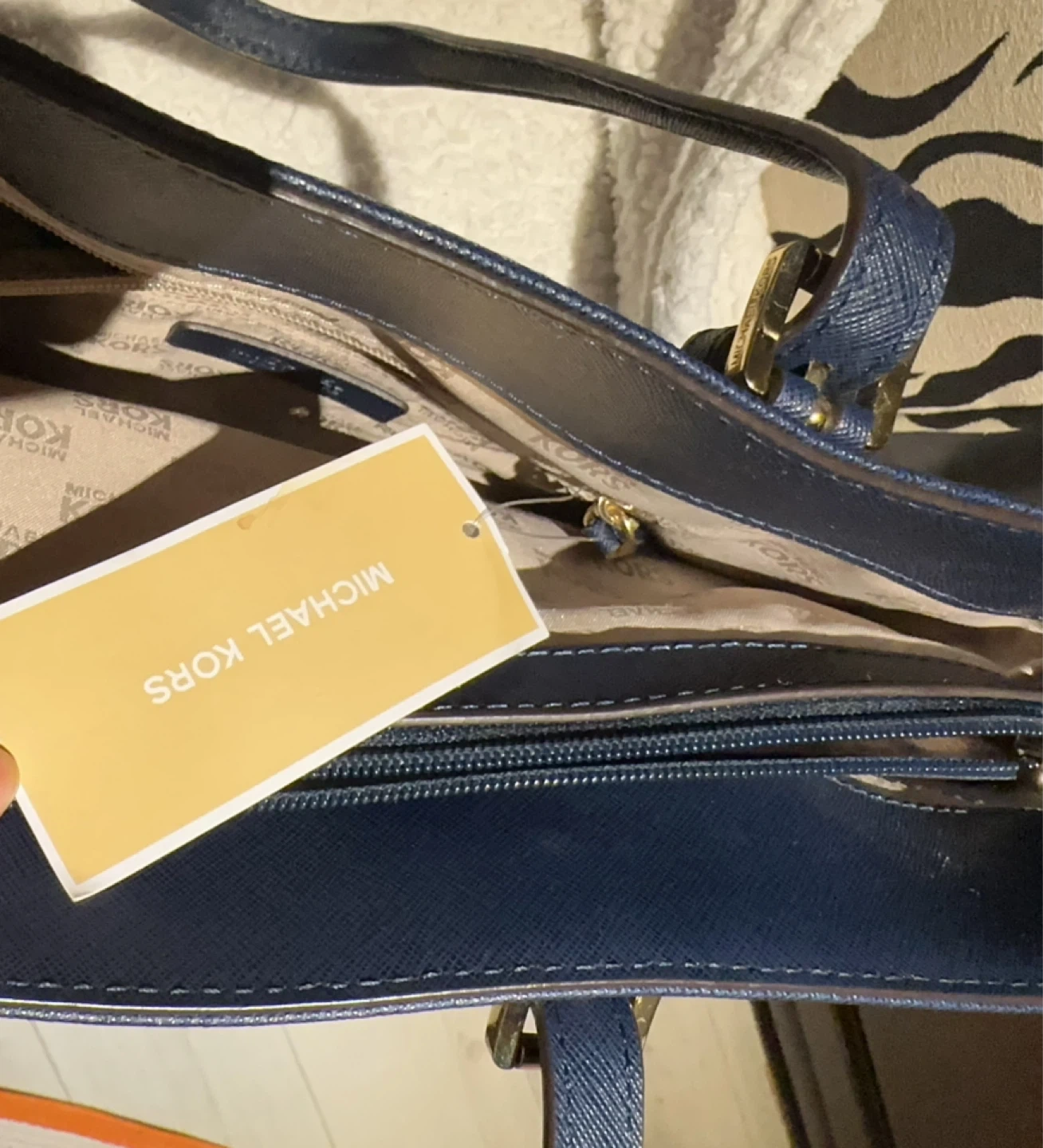 Michael Kors navy blue tote bag. Saffiano leather exterior with gold-tone hardware. Features a front flap pocket and spacious interior with multiple compartments. Classic everyday tote! New with tag, but with some scratches showing on the pictures.