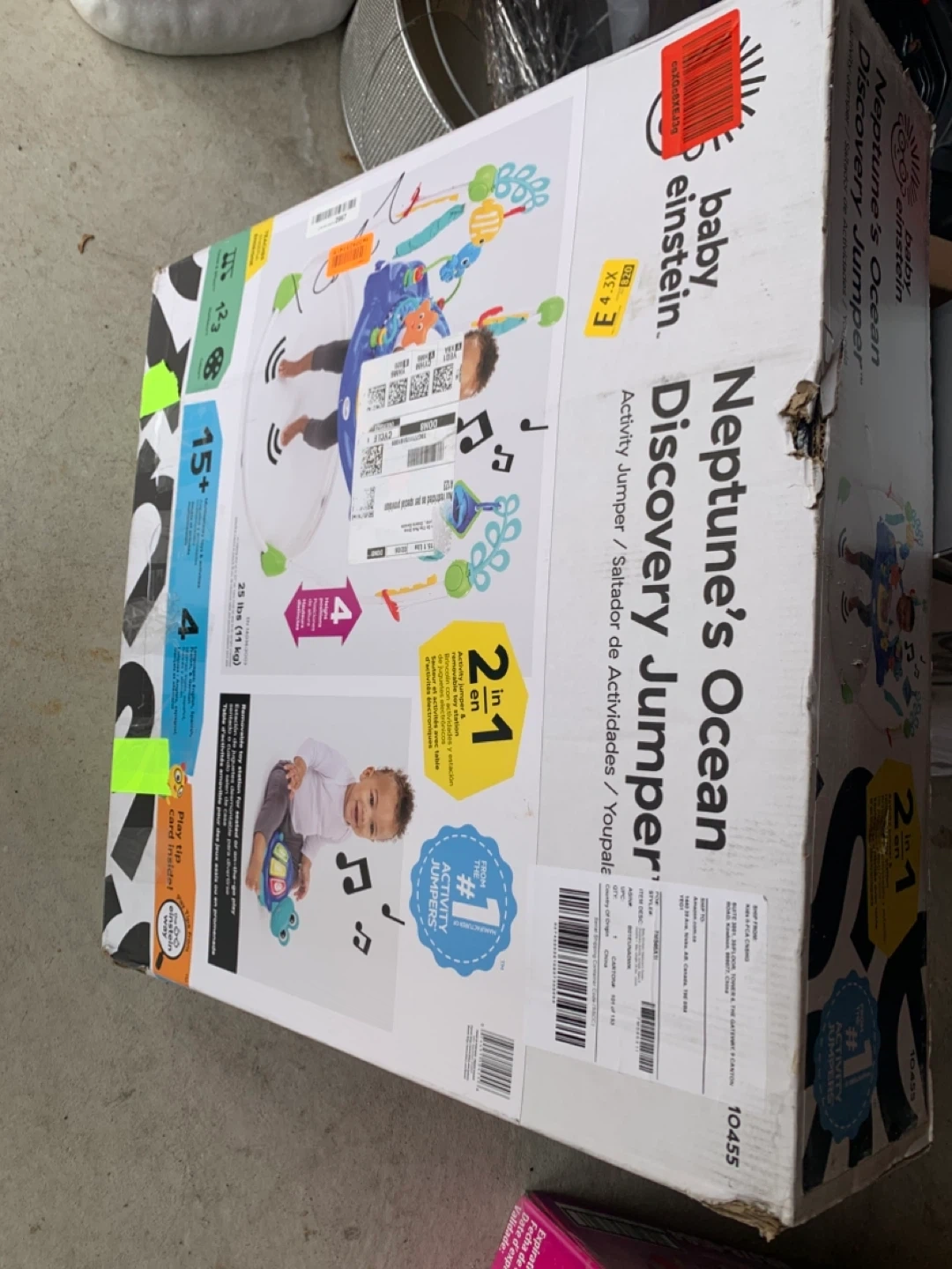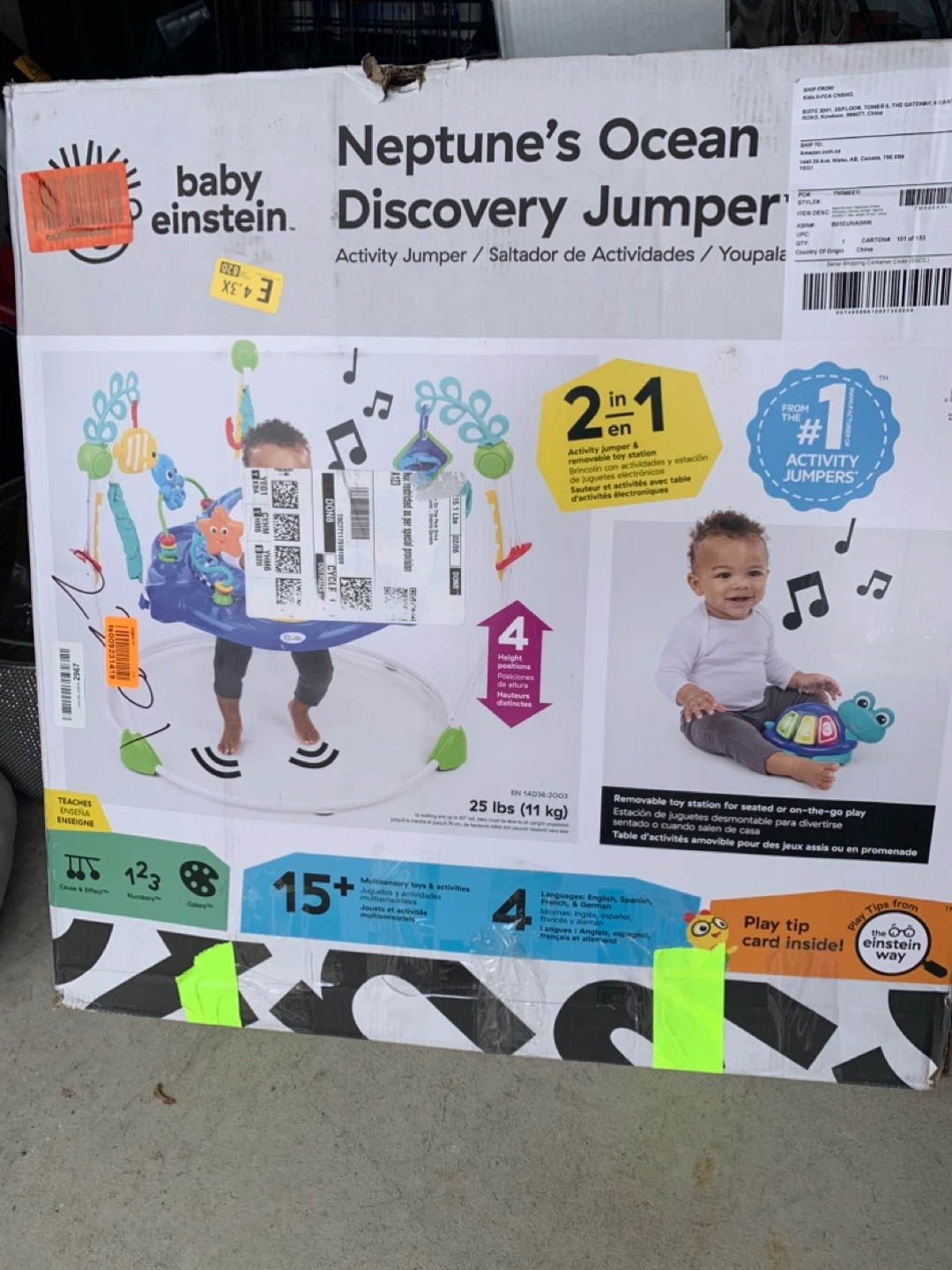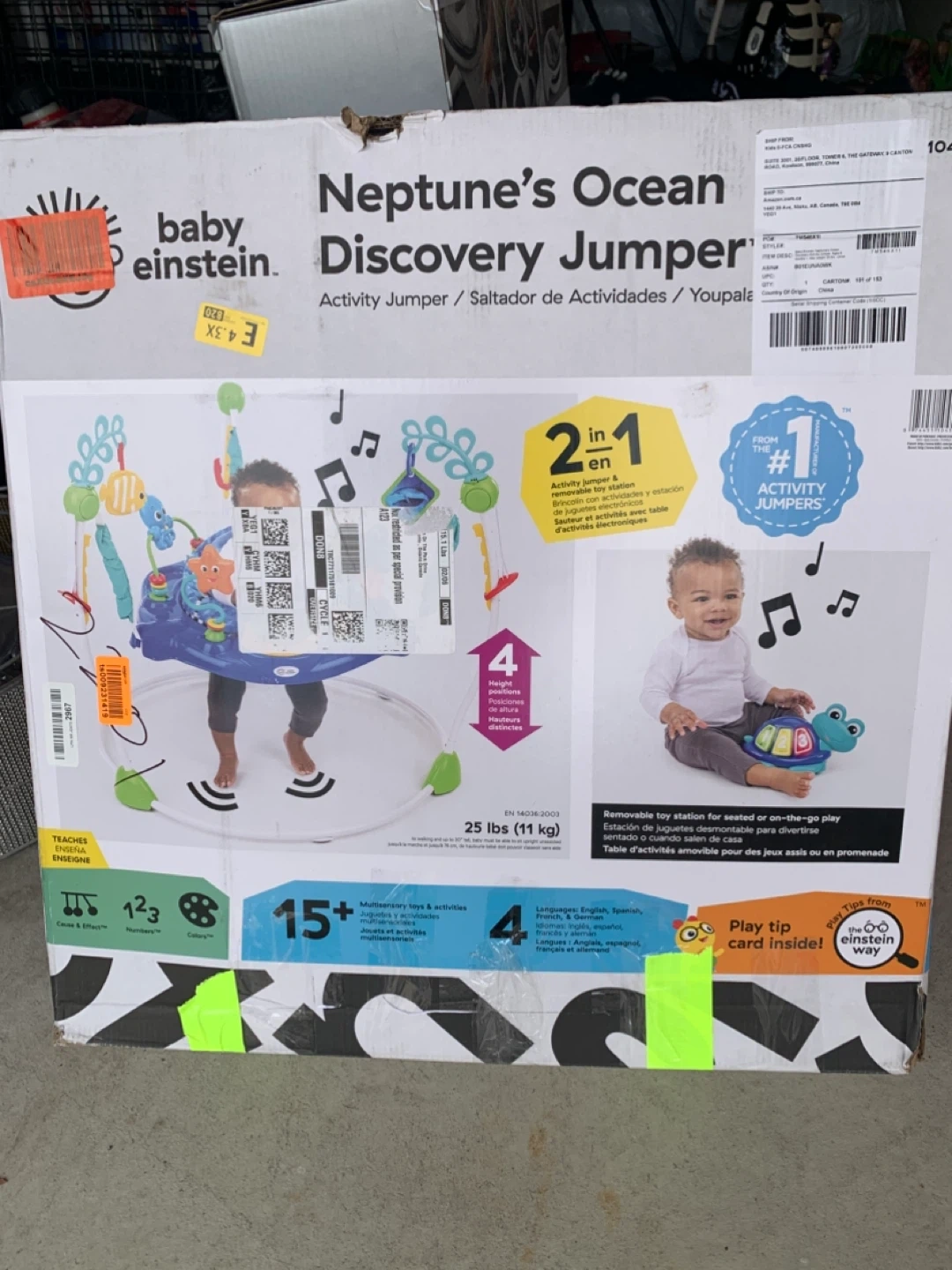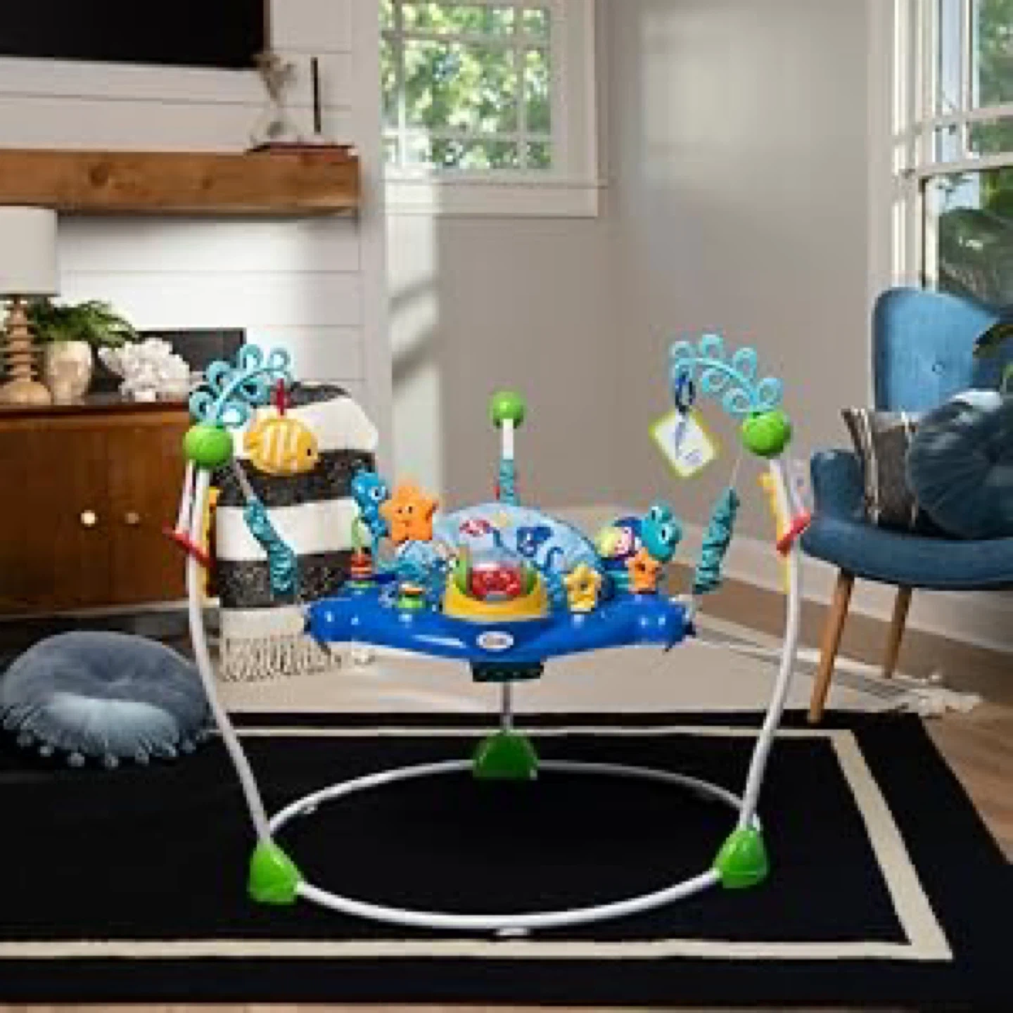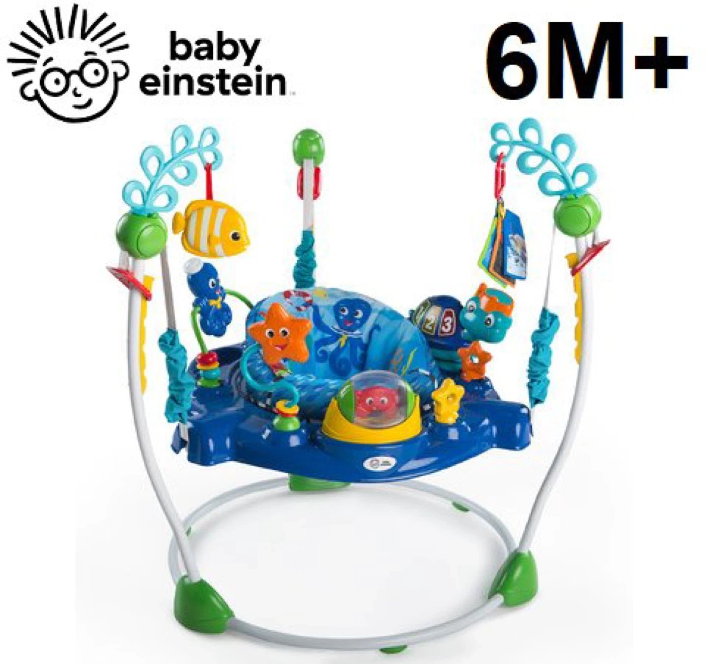 This Baby Einstein Neptune's Ocean Discovery Jumper is designed for babies 6 months and up. It features a 2-in-1 activity jumper and removable toy station. The jumper supports up to 25 lbs (11 kg) and includes 15+ multi-sensory toys and activities.