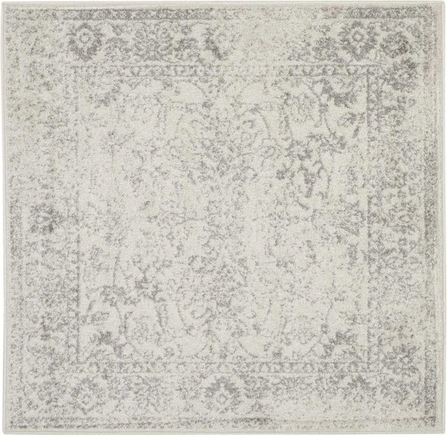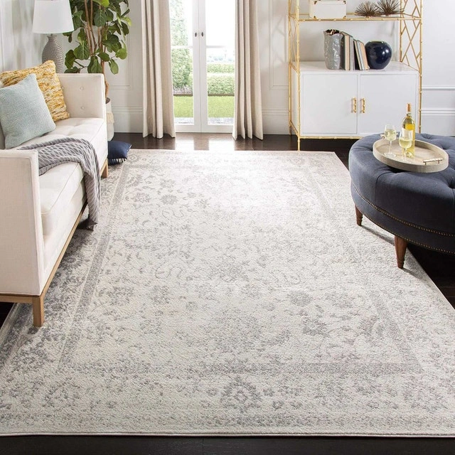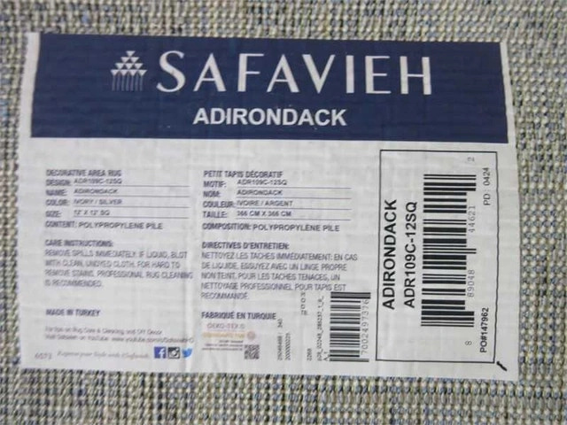 This is a SAFAVIEH Adirondack Collection square rug, showcasing an elegant ivory and silver colour palette, perfect for adding a touch of sophistication to any room. Being previously enjoyed, it's in good condition. It's ready to transform your space with its subtle charm and comforting feel underfoot.