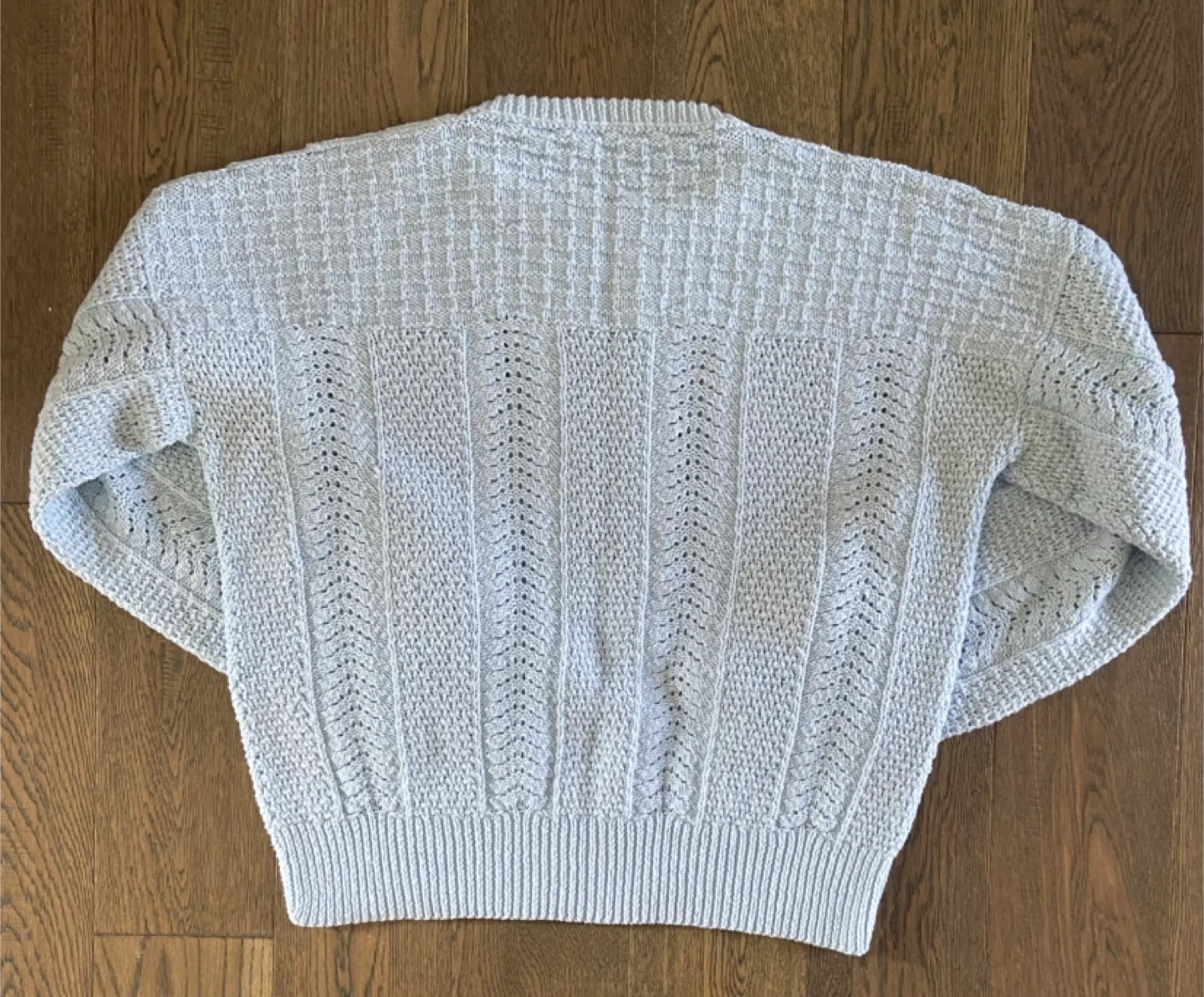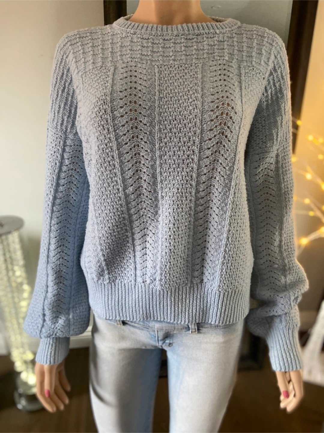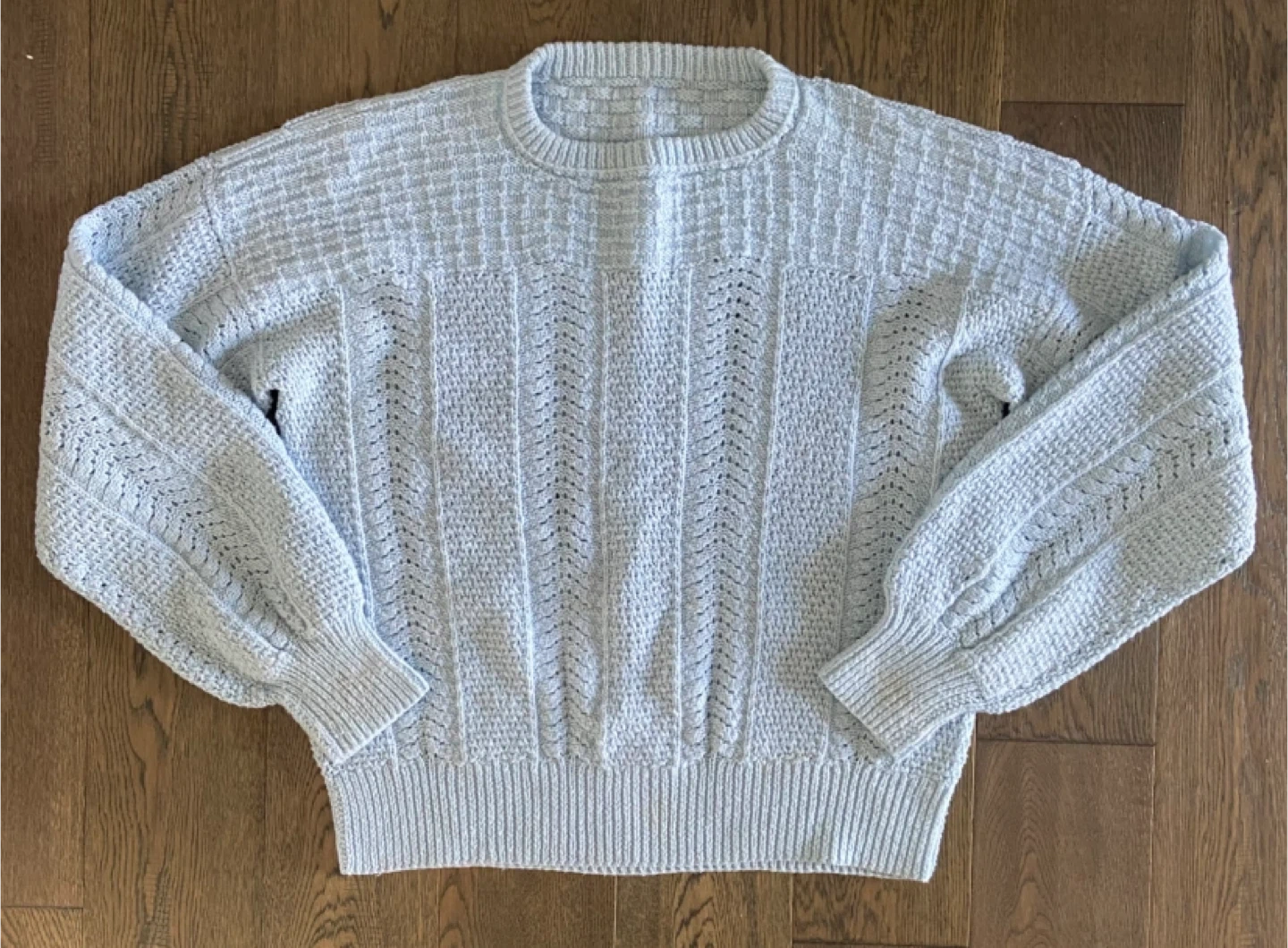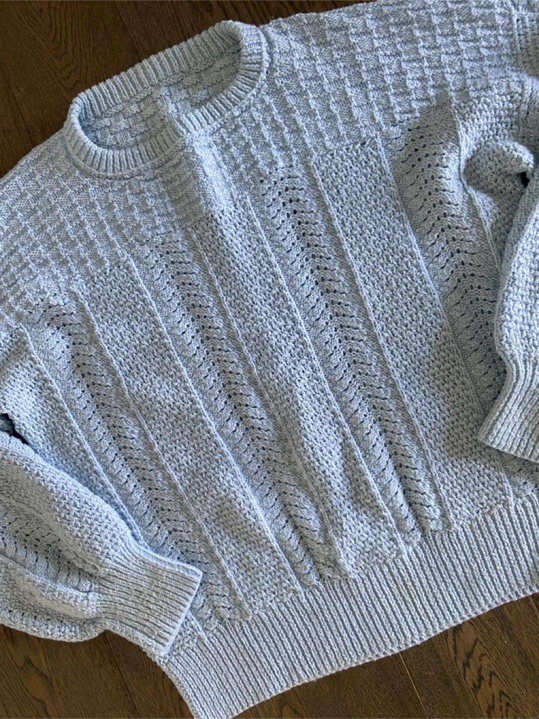 A cozy light blue hand-knitted pullover sweater with a delicate textured pattern
