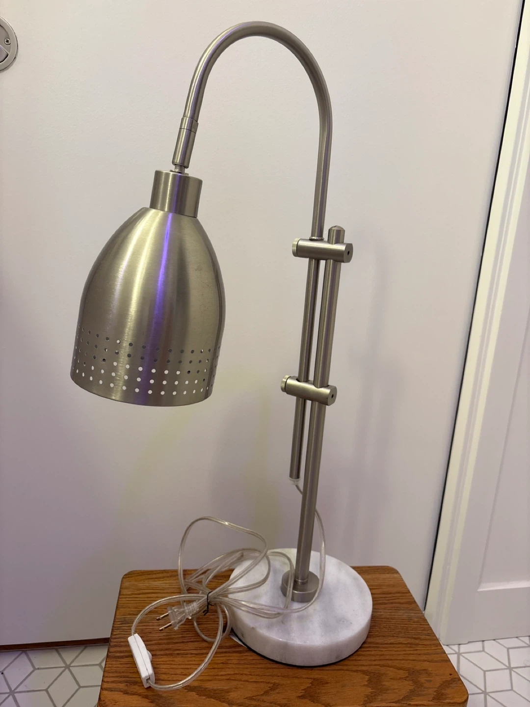 This desk lamp features a brushed nickel finish and a gooseneck design for adjustable lighting. It has a marble base for stability. Perfect for task lighting at your desk or workspace!