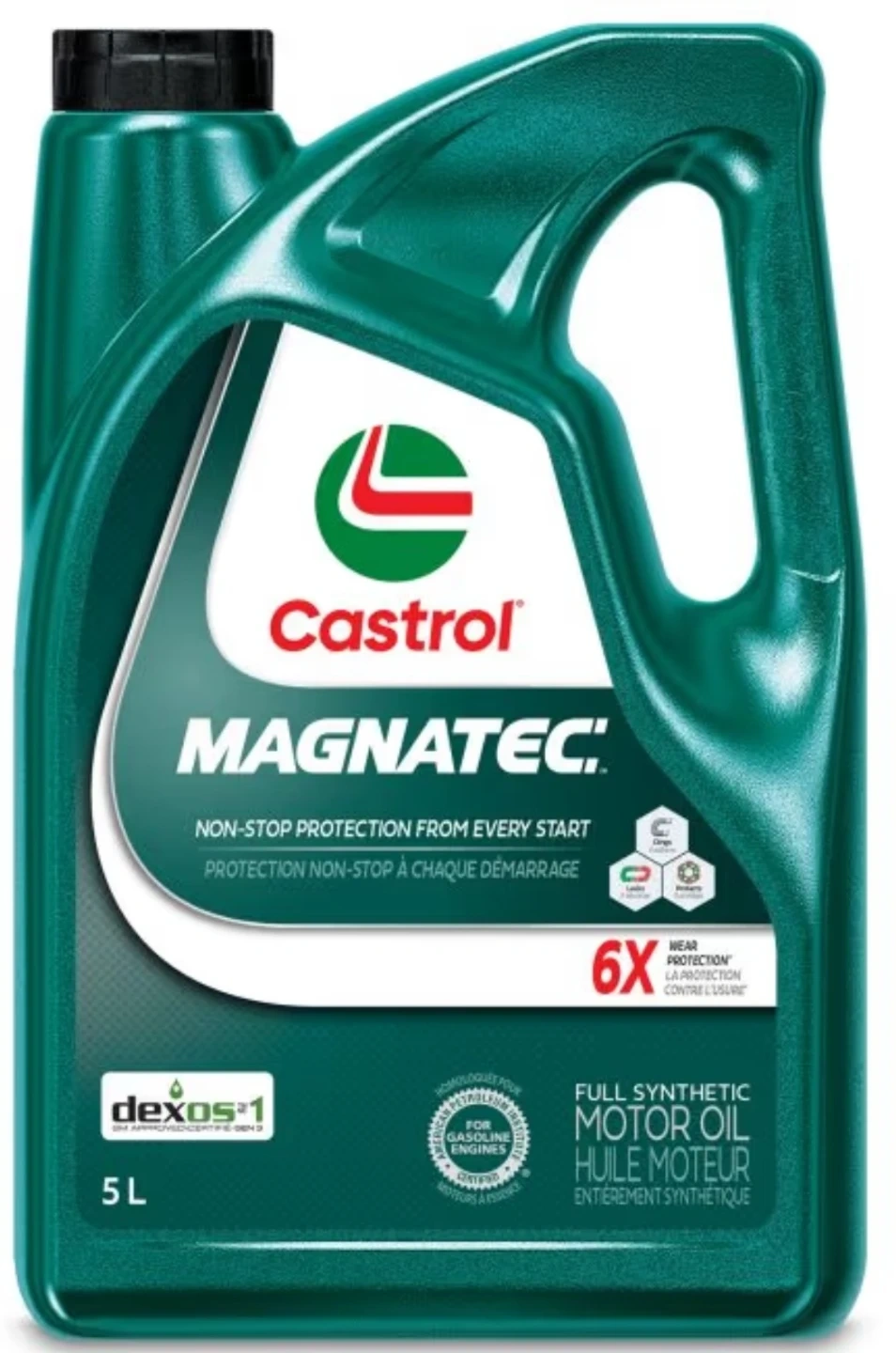 Castrol MAGNATEC full synthetic motor oil. Provides non-stop protection from every start. This is a 5L bottle. It's suitable for gasoline engines and offers 6x wear protection.