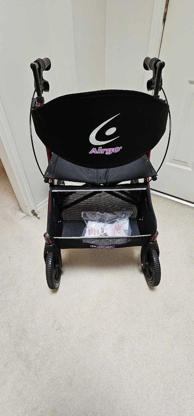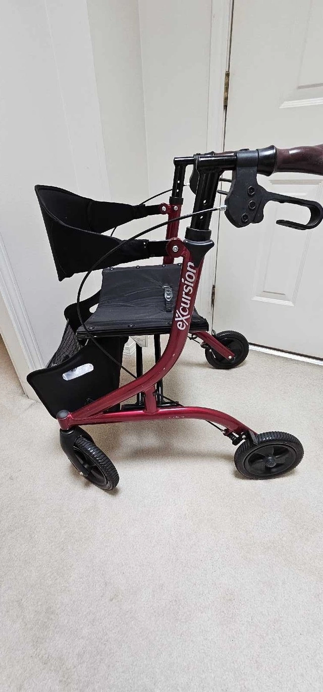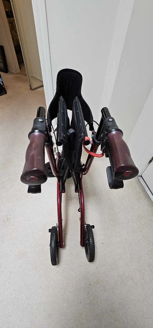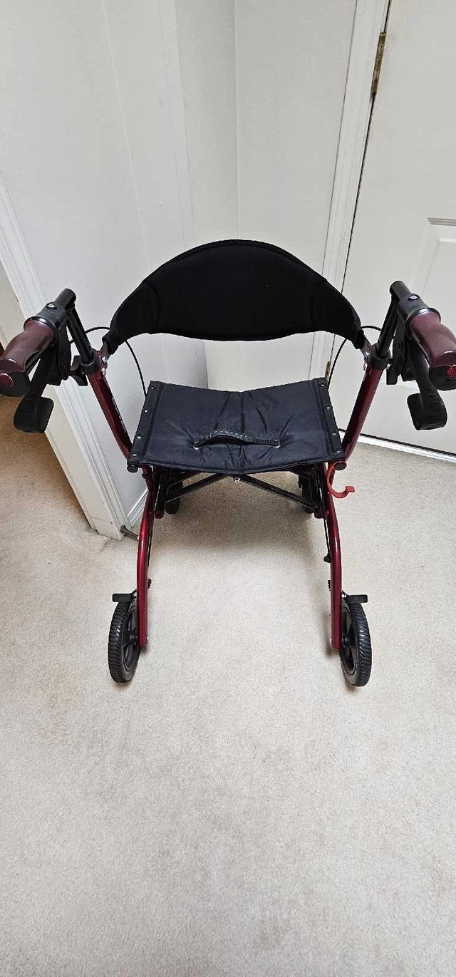 Solid walker that is also a Mobility seat. Adjustable arm heights, 300 lb capacity, foldable and light. Good condition, little used. Was over $400 new