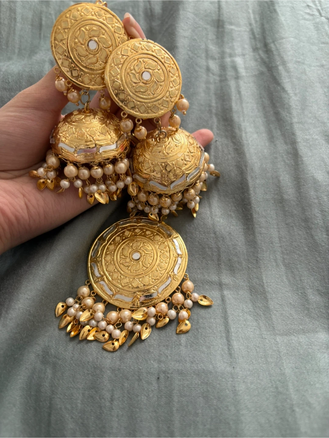 Beautiful gold jhumka earrings with pearl accents! These earrings are in great condition and would be a lovely addition to any outfit. The intricate detailing and classic design make them a timeless piece of jewellery.