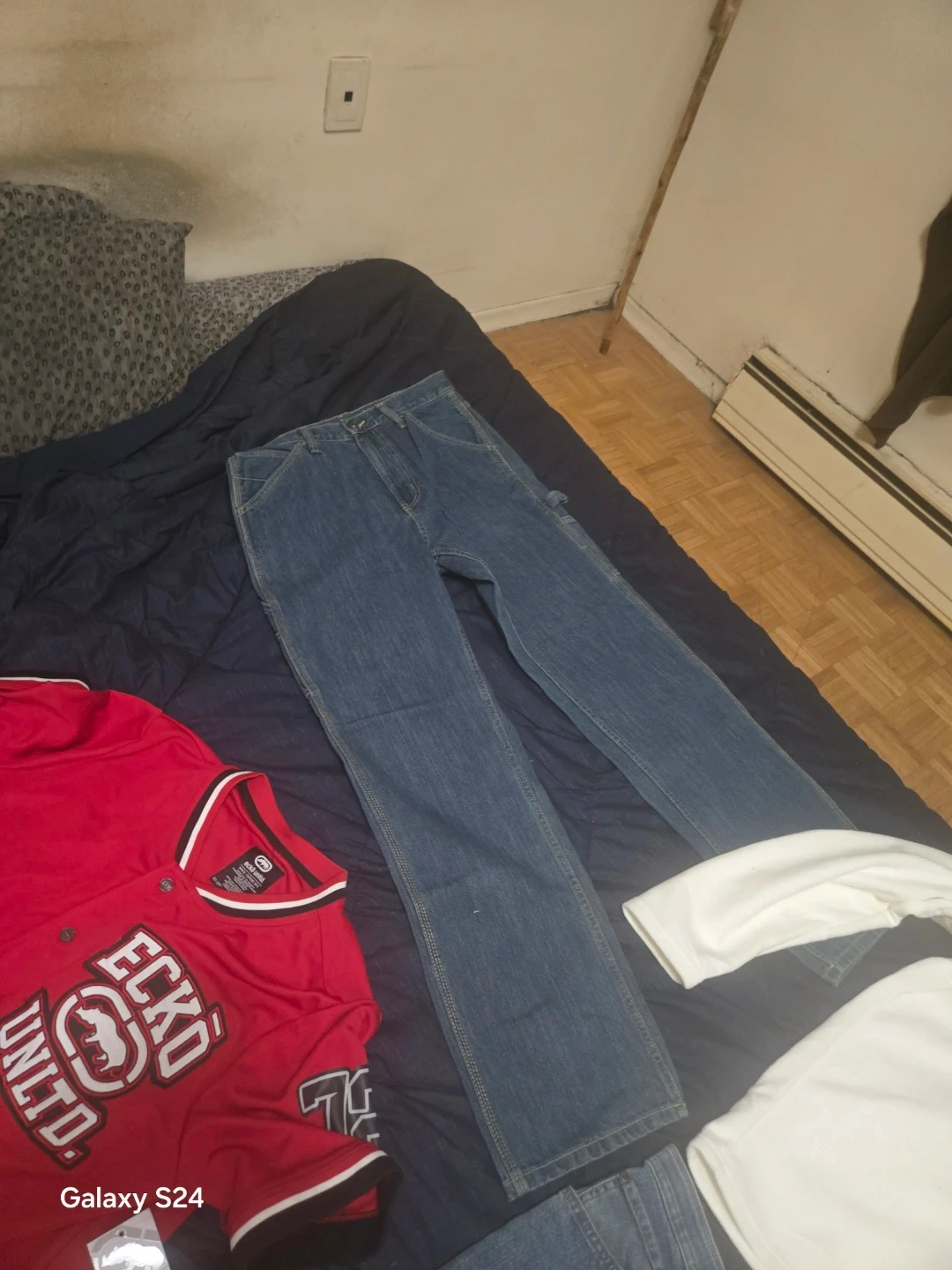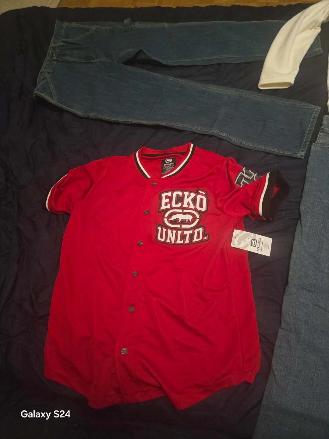 This is an Ecko Unltd. red baseball jersey. It has a button-up front with black and white trim. This jersey is great for casual wear or sporting events! Two pairs of jeans n shirt