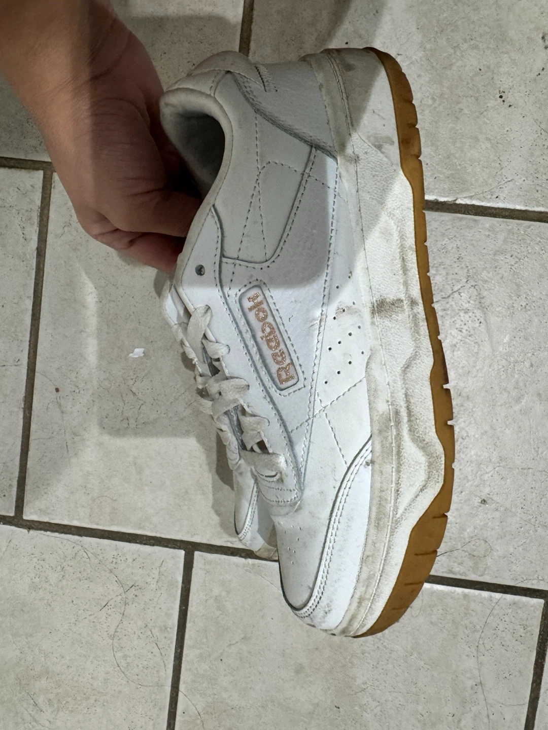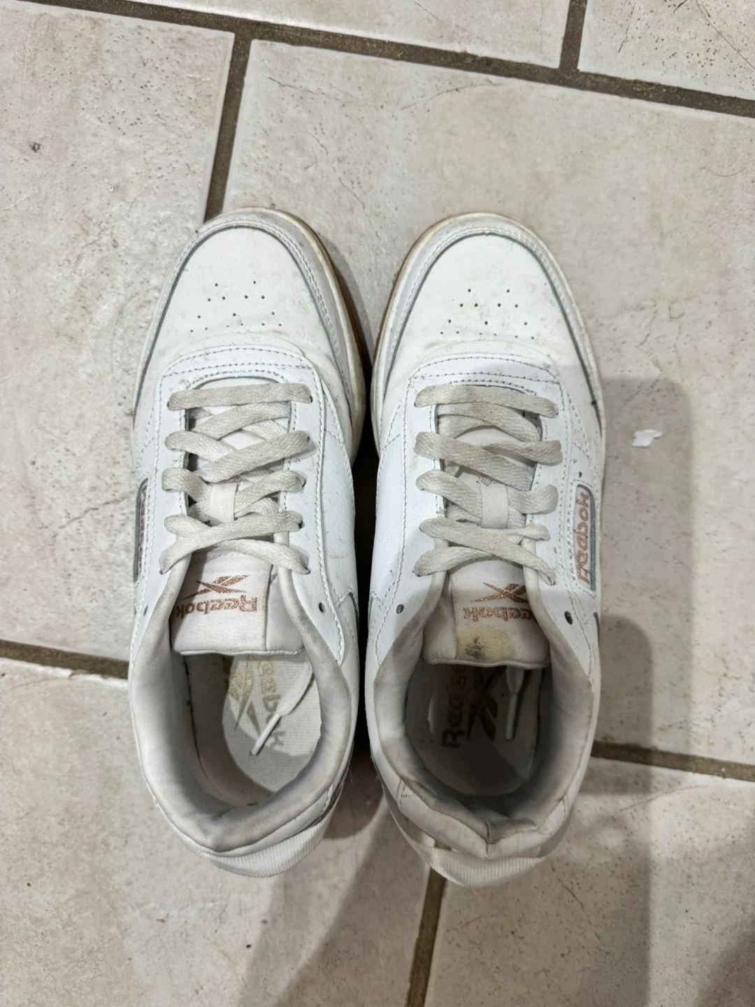 Classic white Reebok sneakers. These shoes are made of leather and have a durable rubber sole. They're a size 7