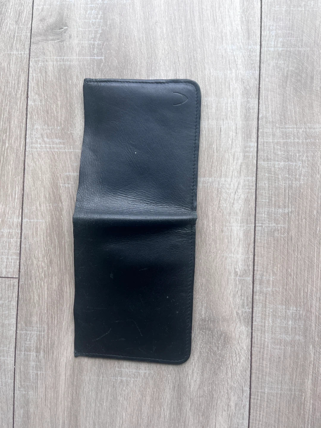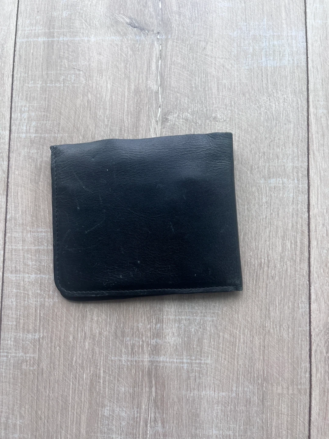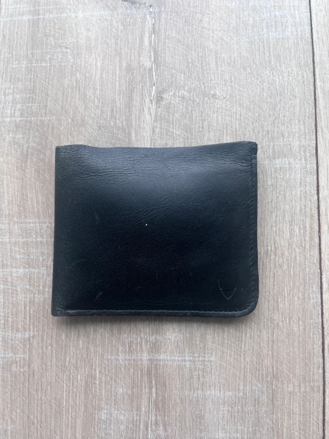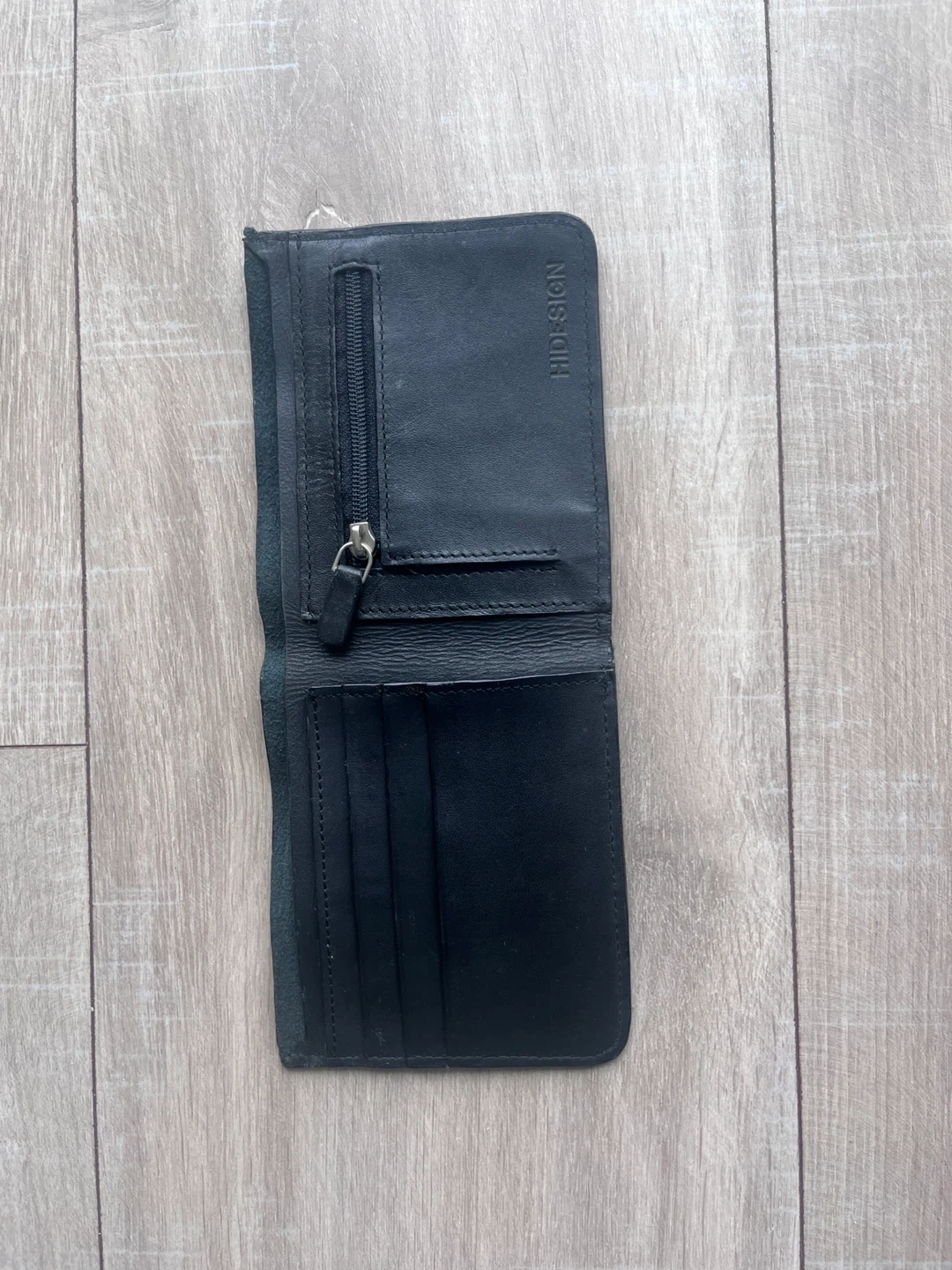 This Hidesign wallet is crafted from black leather. It features a bifold design with multiple card slots and a zippered coin pocket. A classic and durable accessory for everyday use.
