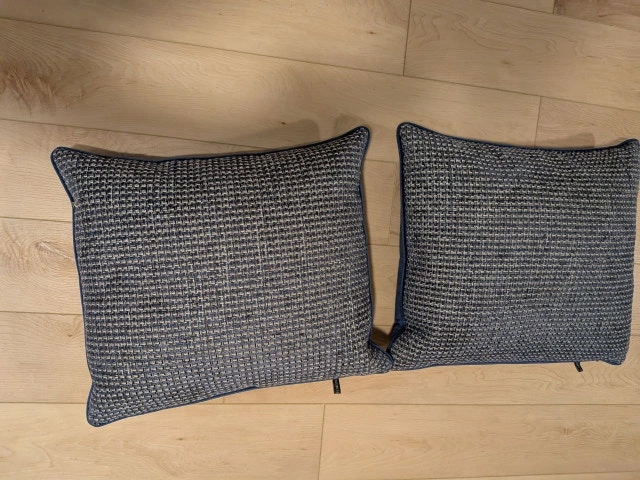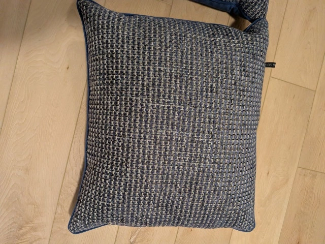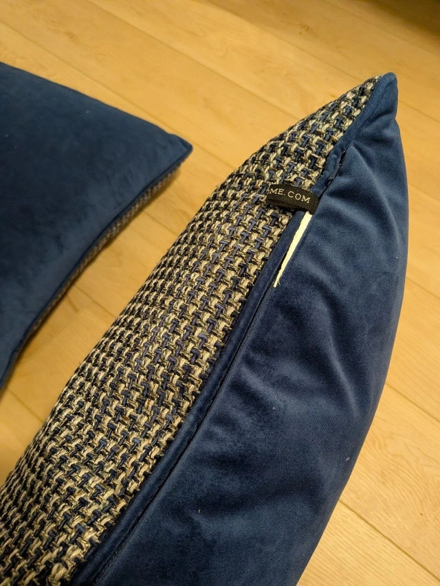 Add a touch of elegance to your living room or bedroom with this beautiful set of high-quality decorative pillows from Rodeo Home. These are reversible, featuring a rich blue velvet on one side and a sophisticated blue/grey woven texture on the other. Brand: Rodeo Home. Dimensions: Approx. 20" x 20". Our Price: $30 for the pair. Condition: Excellent used condition, very clean. Features: Hidden zipper closures and high-quality filling. Regular Price: Similar Rodeo Home luxury pillows retail for $75+ each. Cash accepted. Let me know if you're interested!