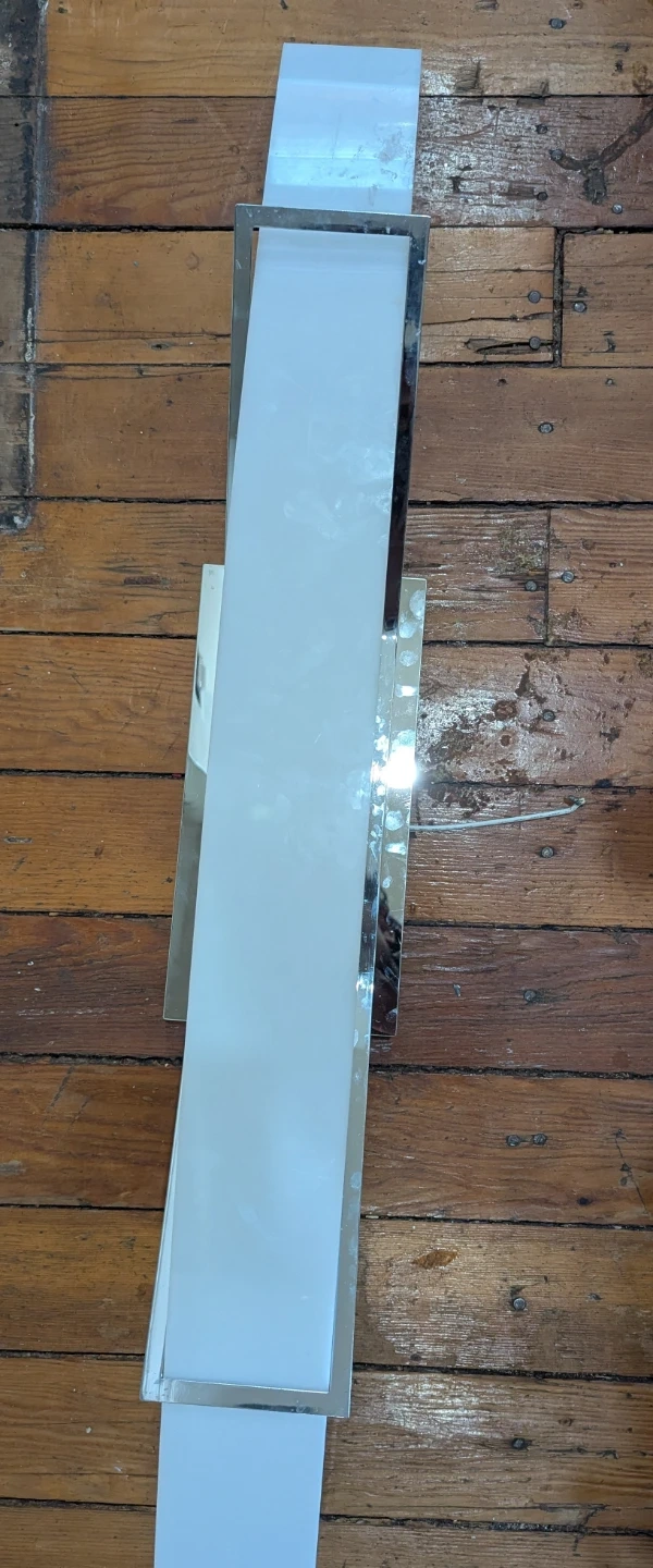 This is a modern sconce wall light fixture with a sleek design. It features a polished chrome frame and a frosted white diffuser. The fixture's dimensions are approximately 24 inches in height and 5 inches in width. It's suitable for ambient lighting in hallways or living rooms.