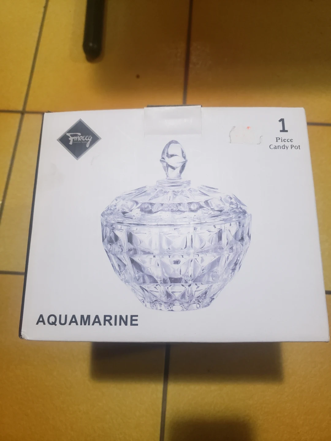 This crystal candy pot is part of the Aquamarine Collection. It's a single piece designed for serving sweets. Perfect for a dining table or countertop!