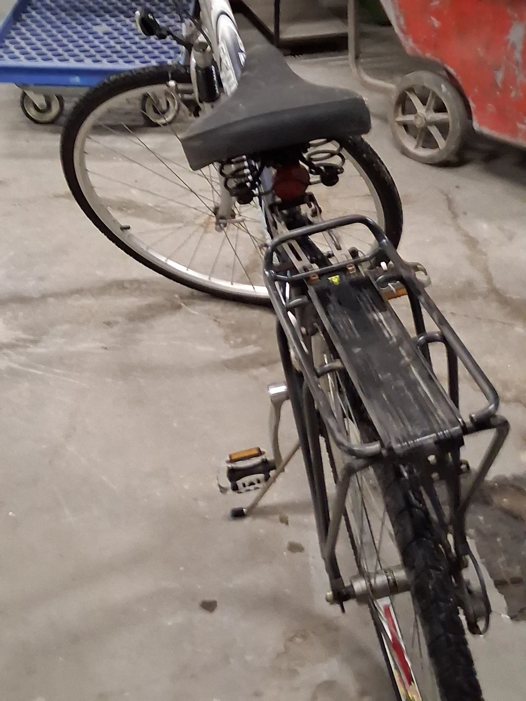This is a Louis Garneau bicycle with 21 speeds and Shimano components. It's made of Cromoly and was designed in Canada. The frame is silver and black. It has a rear rack for carrying items.