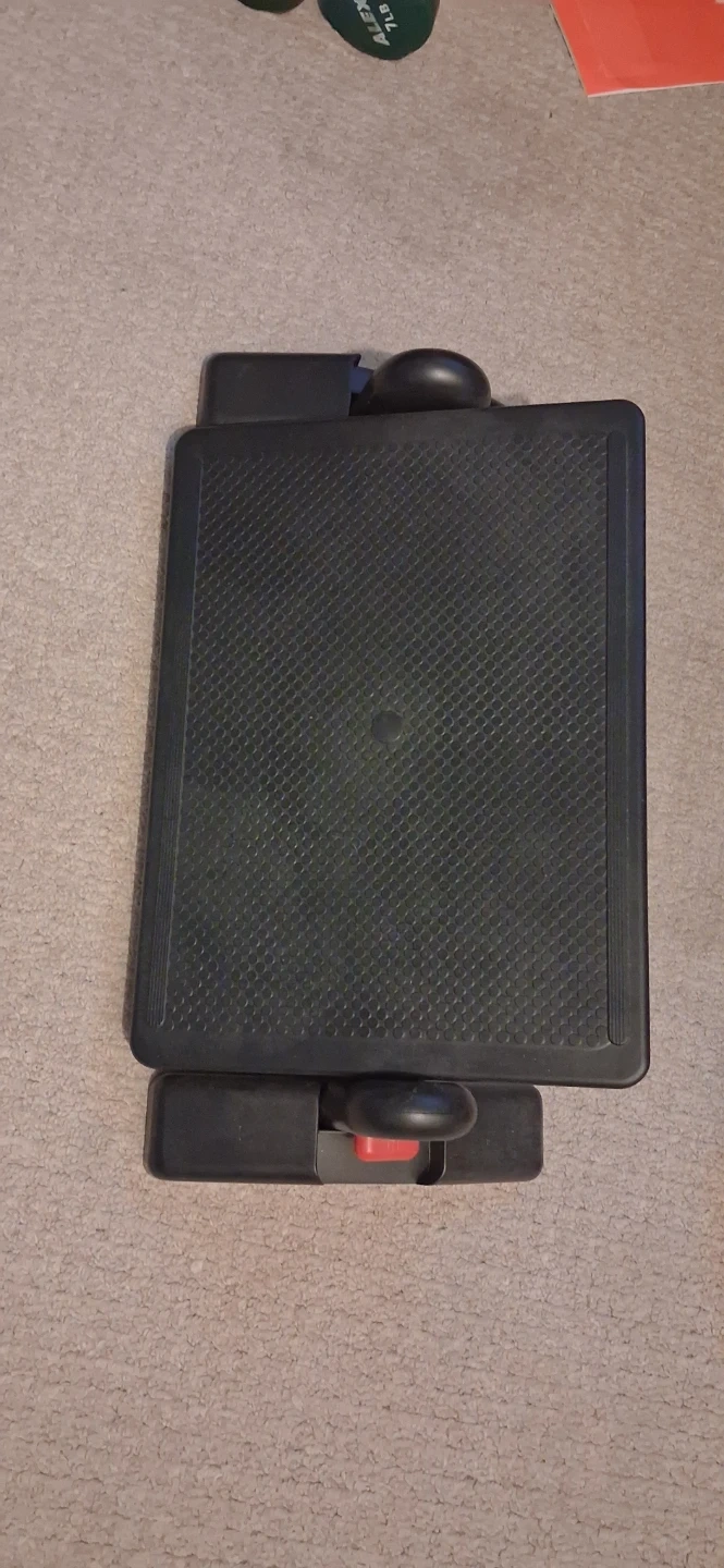 Black Aidata swivel footrest. It's made of durable plastic. This footrest is adjustable for height and tilt. Swivels for comfort!