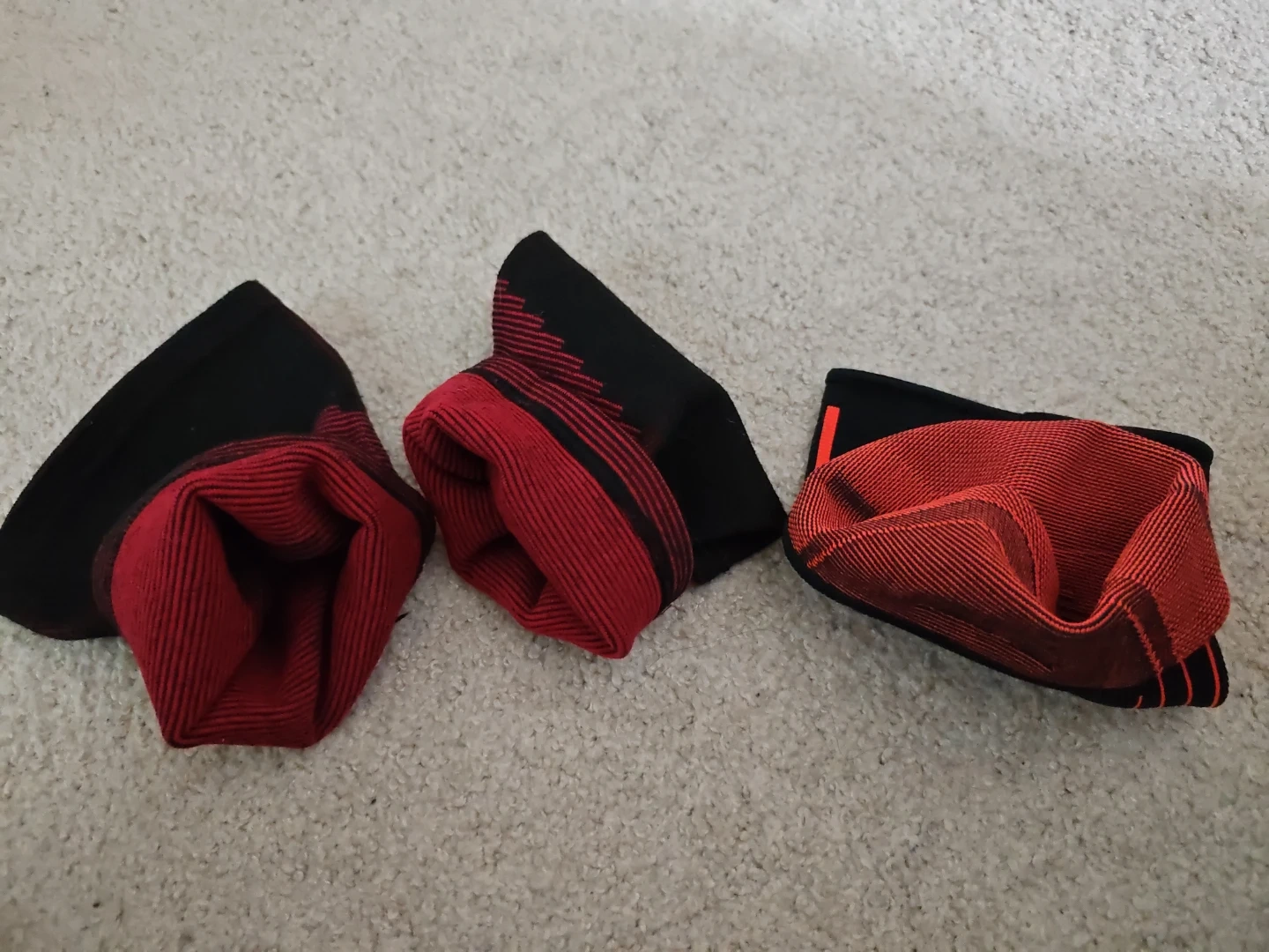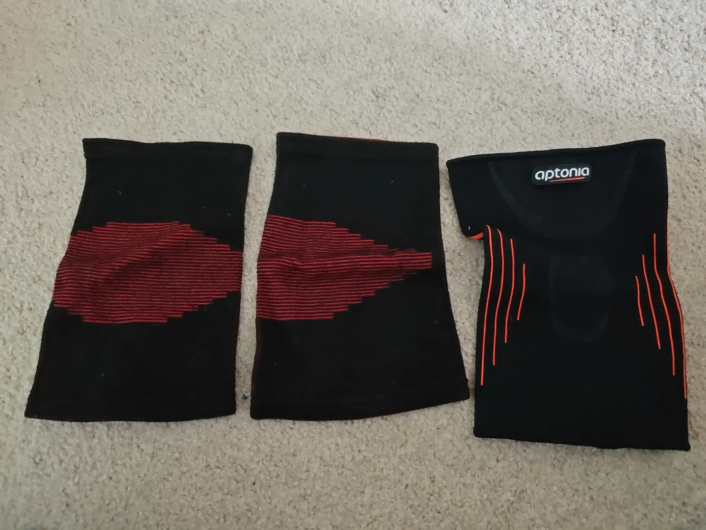 Three Aptonia compression sleeves in black and red. These sleeves are designed for support and comfort during physical activity. They're made from a stretchy, breathable fabric.