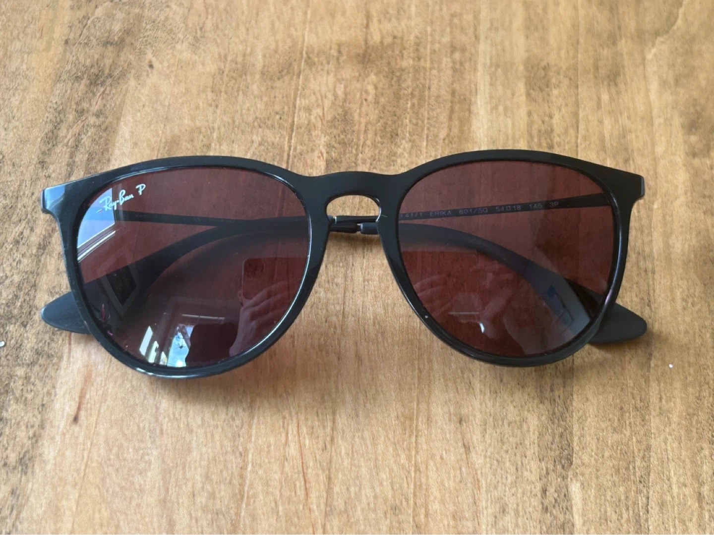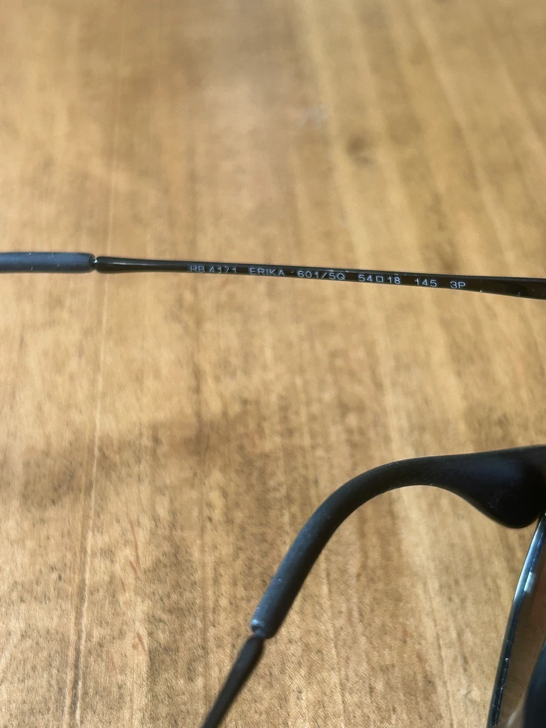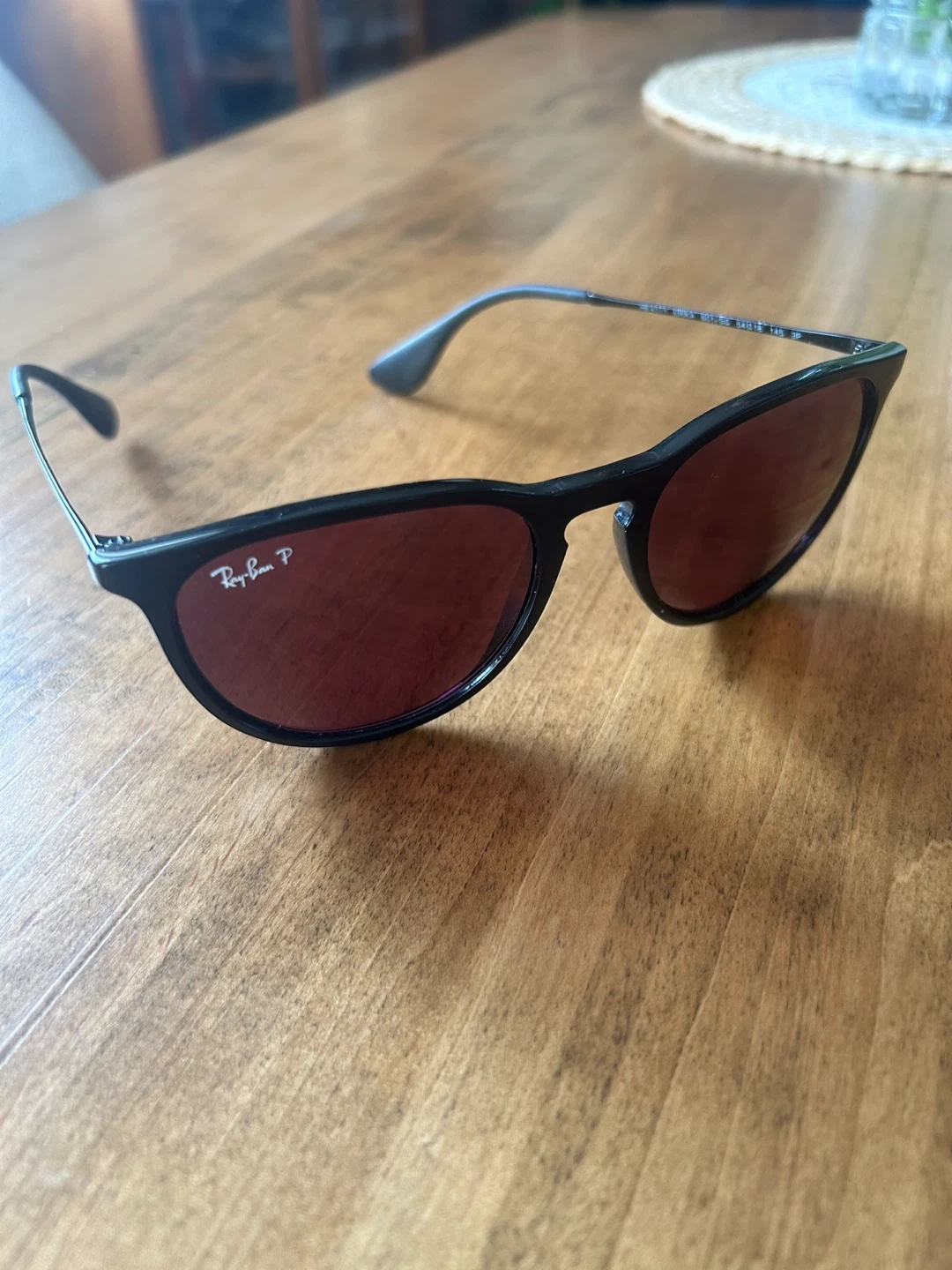 Polarized Ray-Ban Erika sunglasses have black frames with dark tinted lenses. Model RB 4171 601/5Q features a 54mm lens width, 18mm bridge, and 145mm temple length. Lightweight nylon frame has slim metal arms and comfortable bridge design.