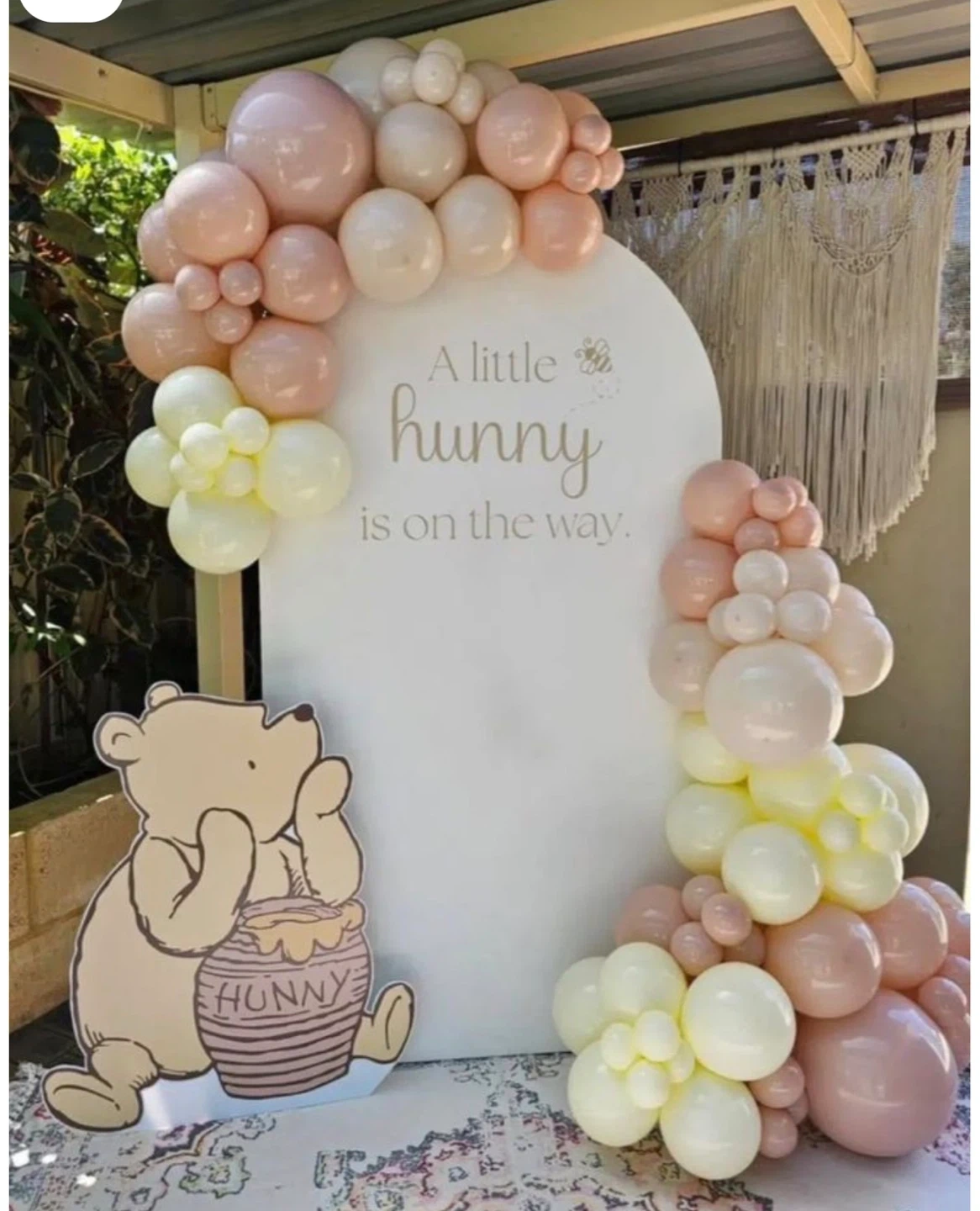 Cute Winnie the Pooh themed backdrop for a baby shower or birthday party! Features "A little hunny is on the way" text and a balloon garland. Perfect for creating memorable photos! We provide balloon decoration services