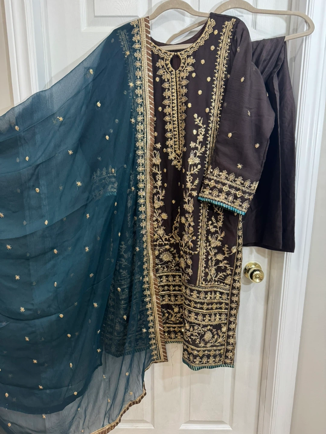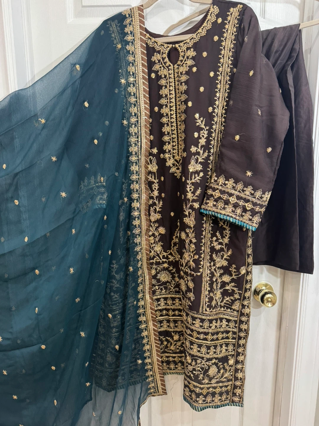 Beautiful brown salwar kameez suit with intricate gold embroidery. Includes the kameez (top), salwar (pants), and a matching dupatta (scarf). Perfect for special occasions or cultural events