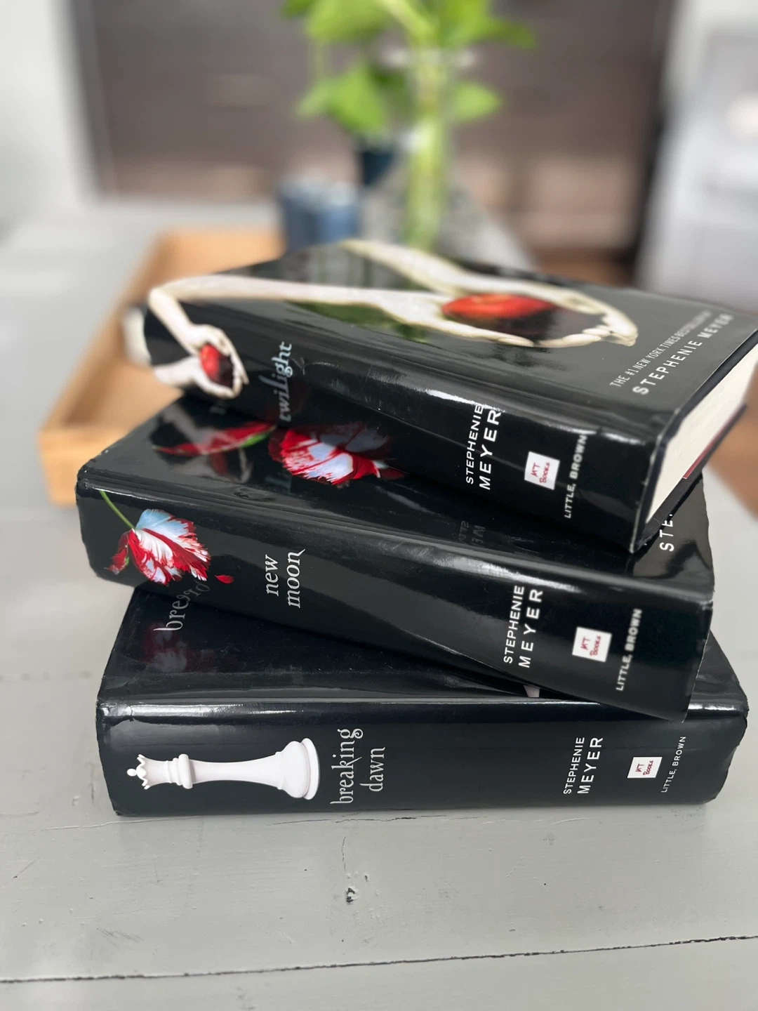 This is the Twilight Saga book series by Stephenie Meyer. It includes the titles Twilight, New Moon, and Breaking Dawn. Published by Little, Brown.