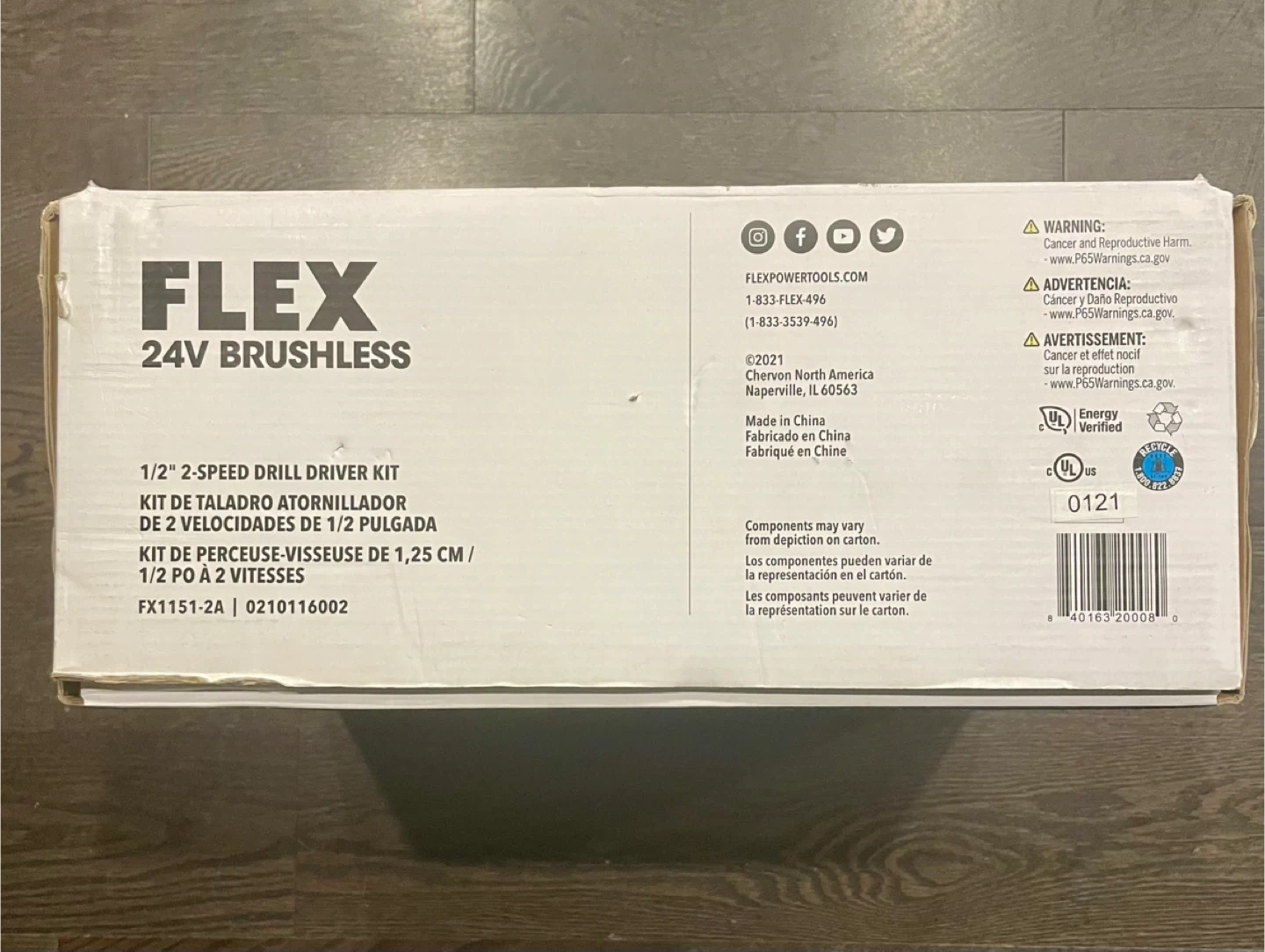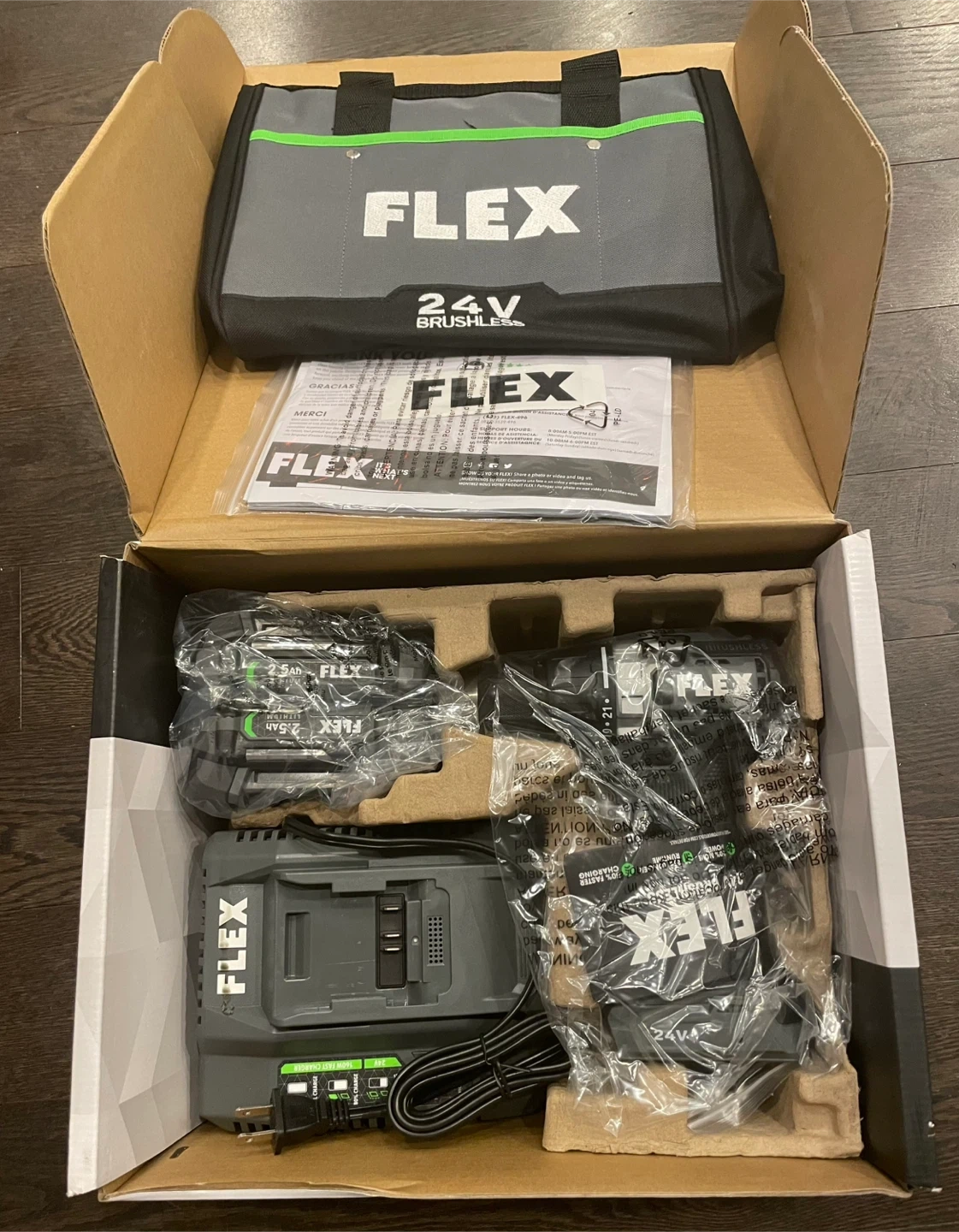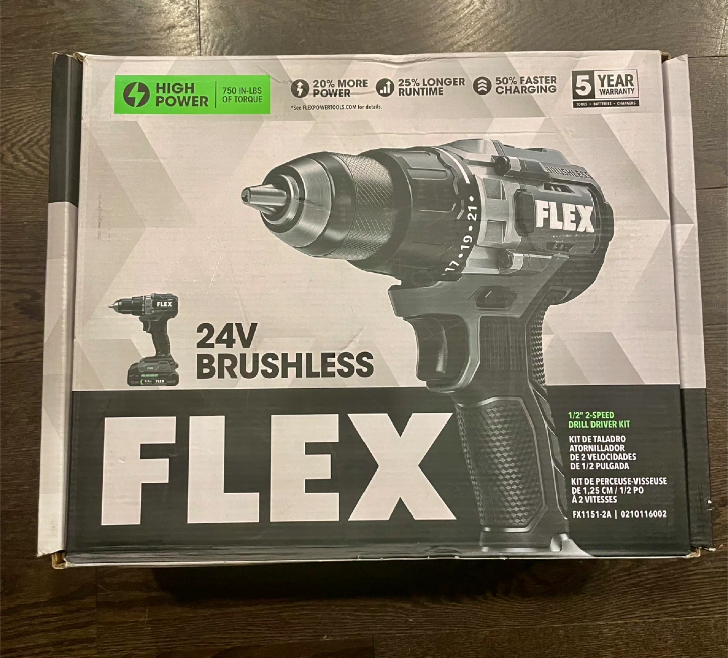 I have a brand new FLEX 24V Brushless 1/2" 2-Speed Drill Driver Kit available! It's still in the box and includes all components. This high-power drill has 750 in-lbs of torque and offers 20% more power with 25% longer runtime and 50% faster charging. It also comes with a 5-year warranty on the tool, batteries, and charger