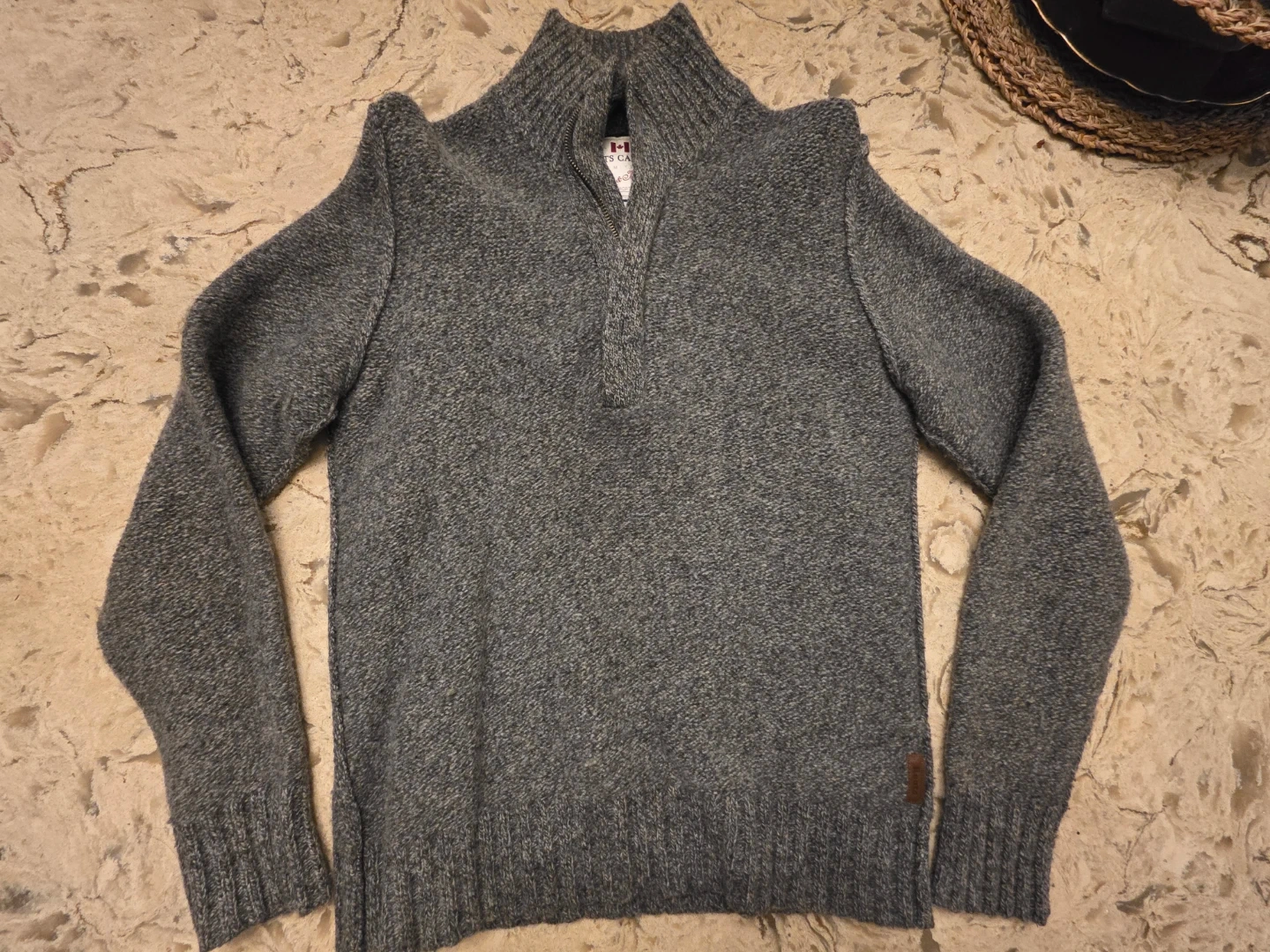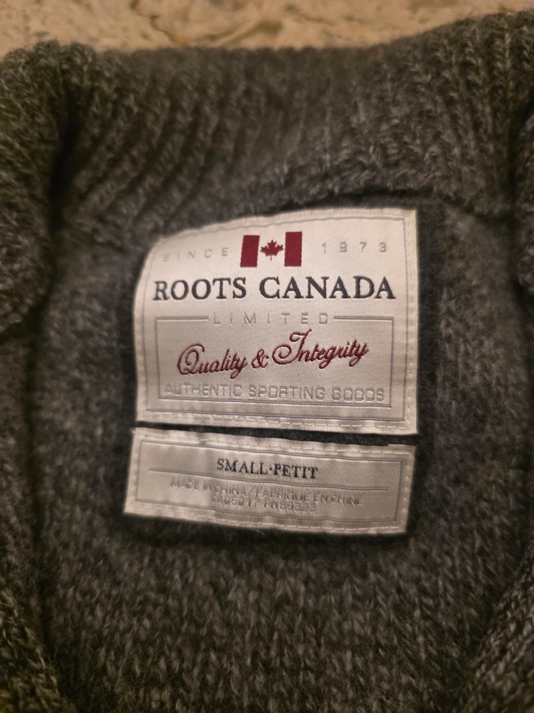 Here's a cozy Roots Canada sweater in size small! It's a lovely grey colour and made of 100% lambswool. Perfect for staying warm on chilly days