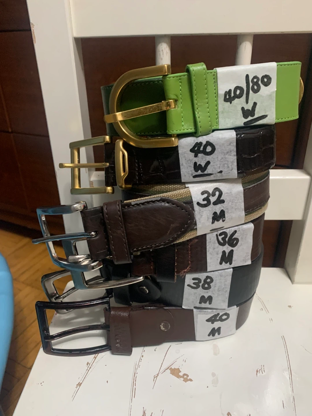 A collection of five men's belts. Includes a green leather belt marked 40/80W, a dark brown embossed belt marked 40W, a brown and tan striped belt marked 32M, a black belt marked 36M, and a dark brown belt marked 38M. All belts are marked with their respective sizes.