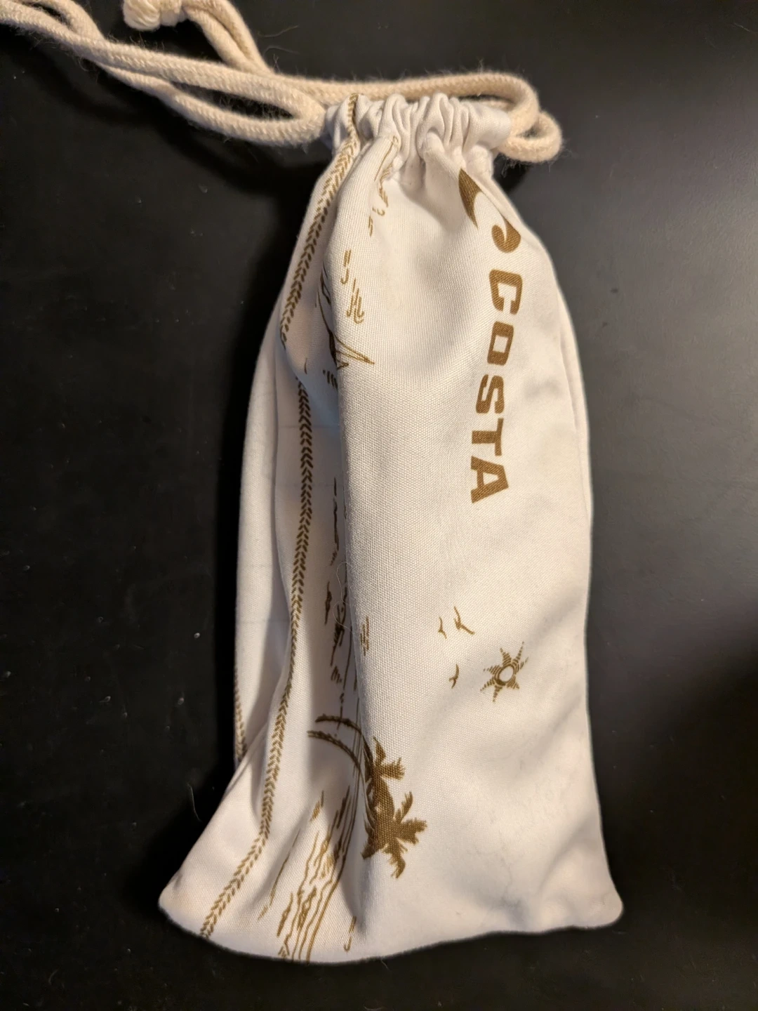Costa sunglasses with a tortoise shell frame and light blue accents. Includes a drawstring pouch for storage. They offer UV protection.