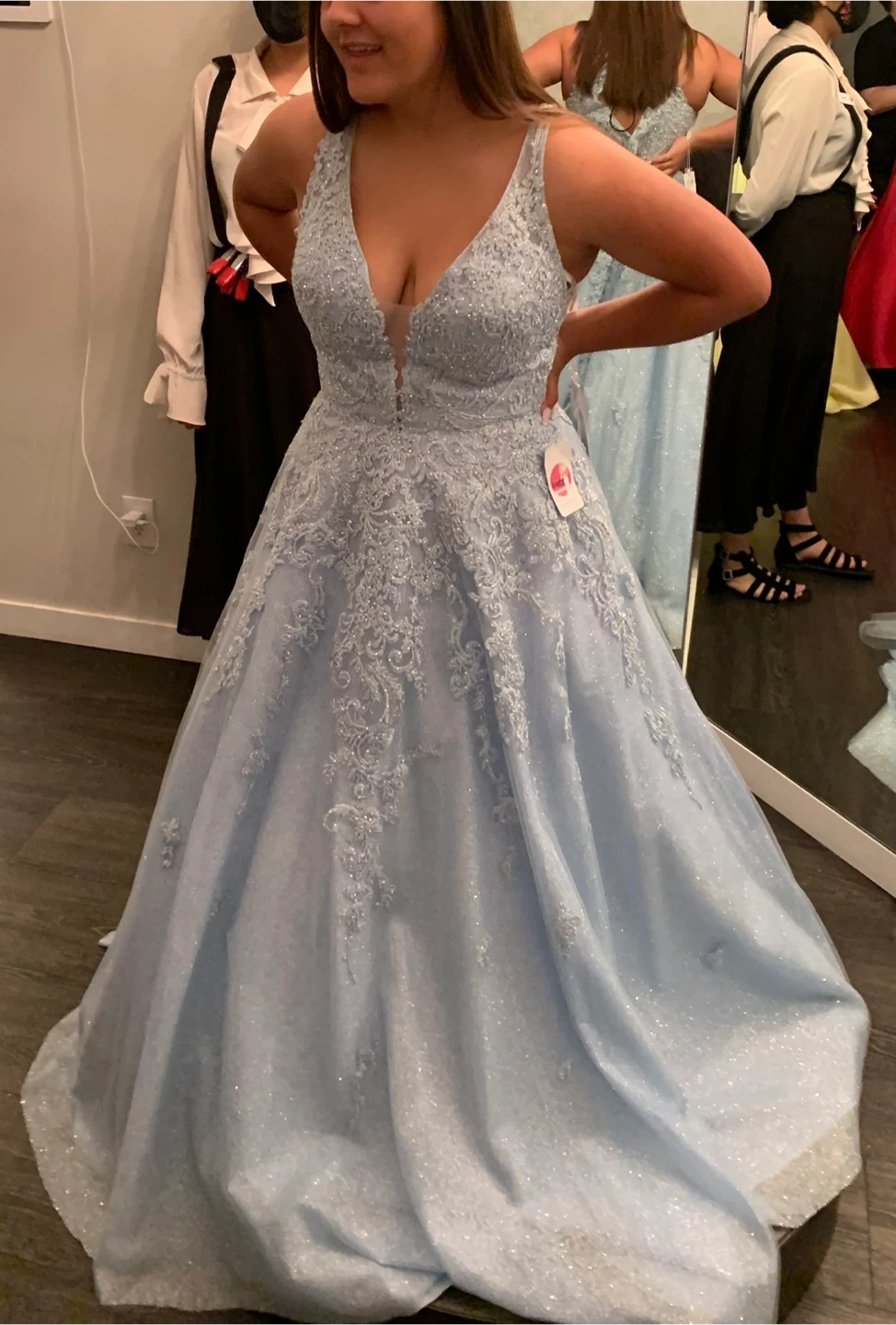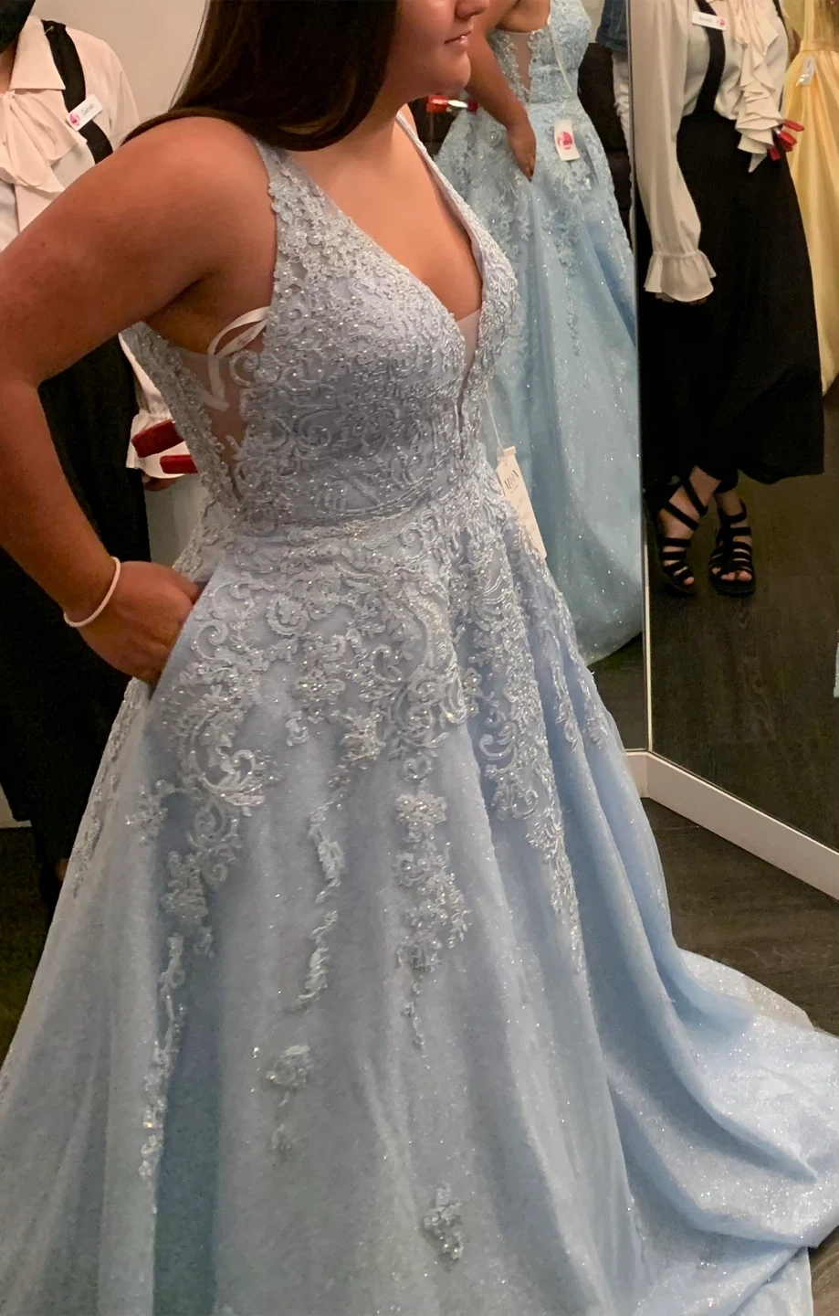 Beautiful light blue prom dress with intricate lace appliqué and shimmering sequin details. It features a V-neckline and a full, flowing skirt. This dress is perfect for formal events and dances!