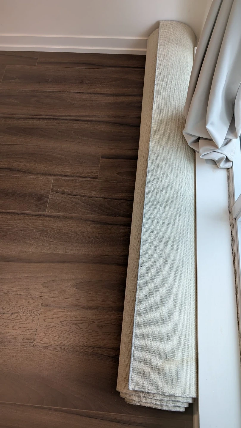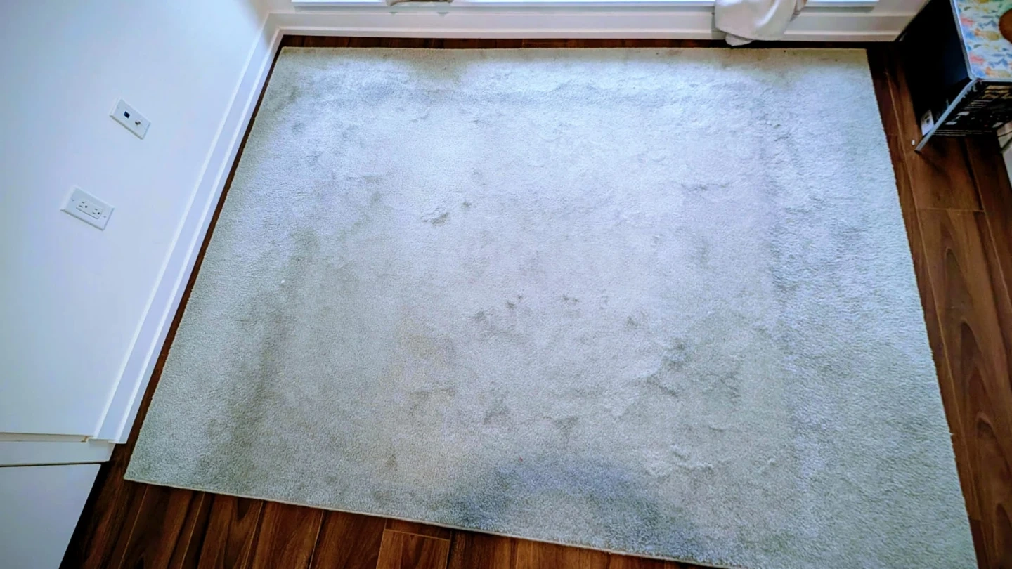 This is a light grey area rug. It's a shaggy plush style with a soft texture. It's a nice size for a living room or bedroom.