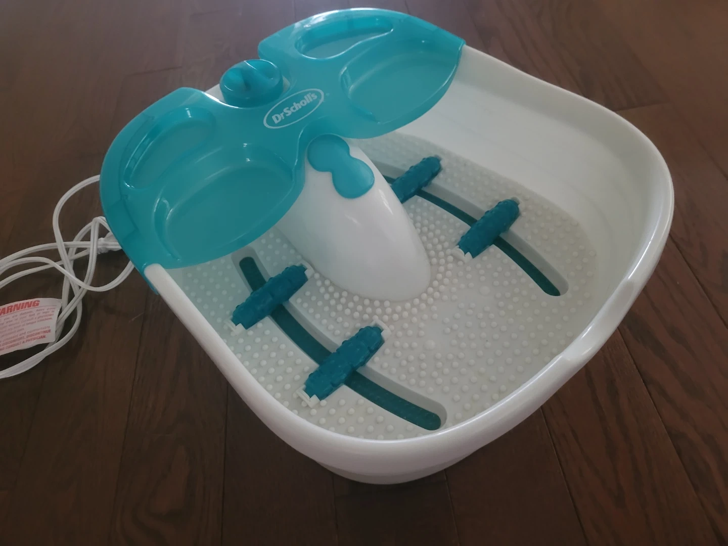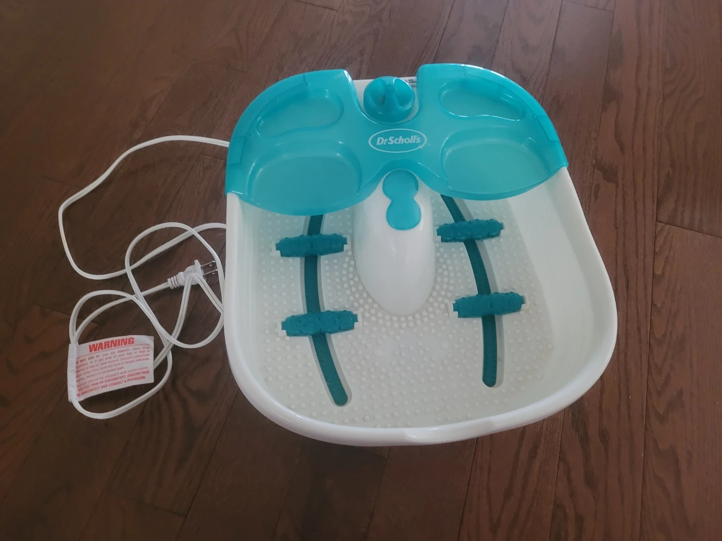 This is a Dr. Scholl's Invigorating Pedicure Foot Spa. It is white with teal accents. It has a control knob on top. This foot spa is designed to invigorate and pamper your feet with its massage rollers and soothing heat
