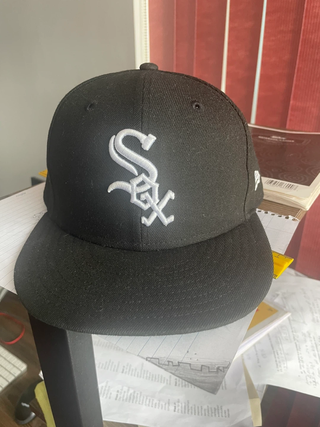 Black New Era fitted hat with embroidered White Sox logo. Made with a polyester blend. This hat is a size 7 1/4 . It's perfect for any baseball fan!