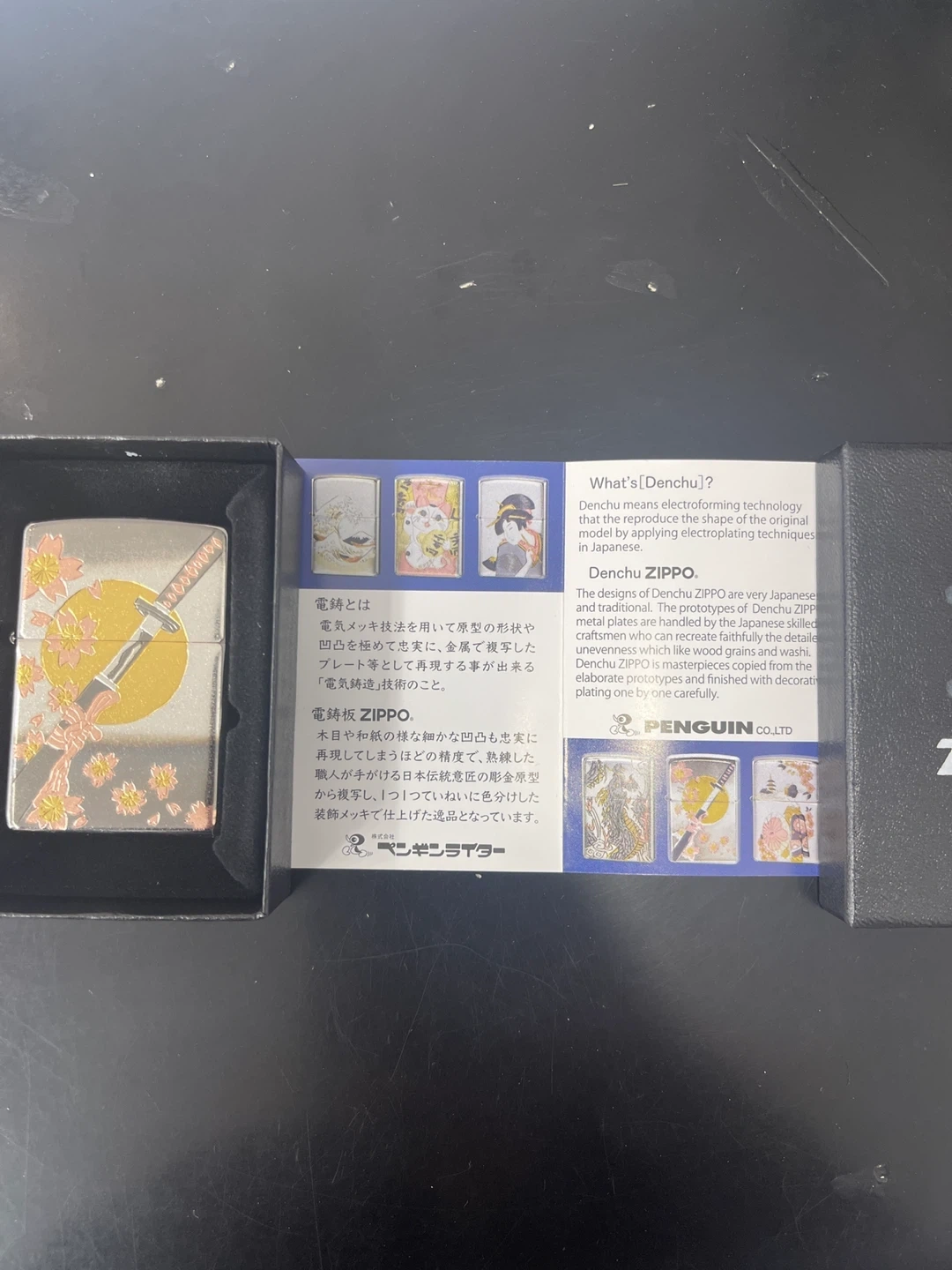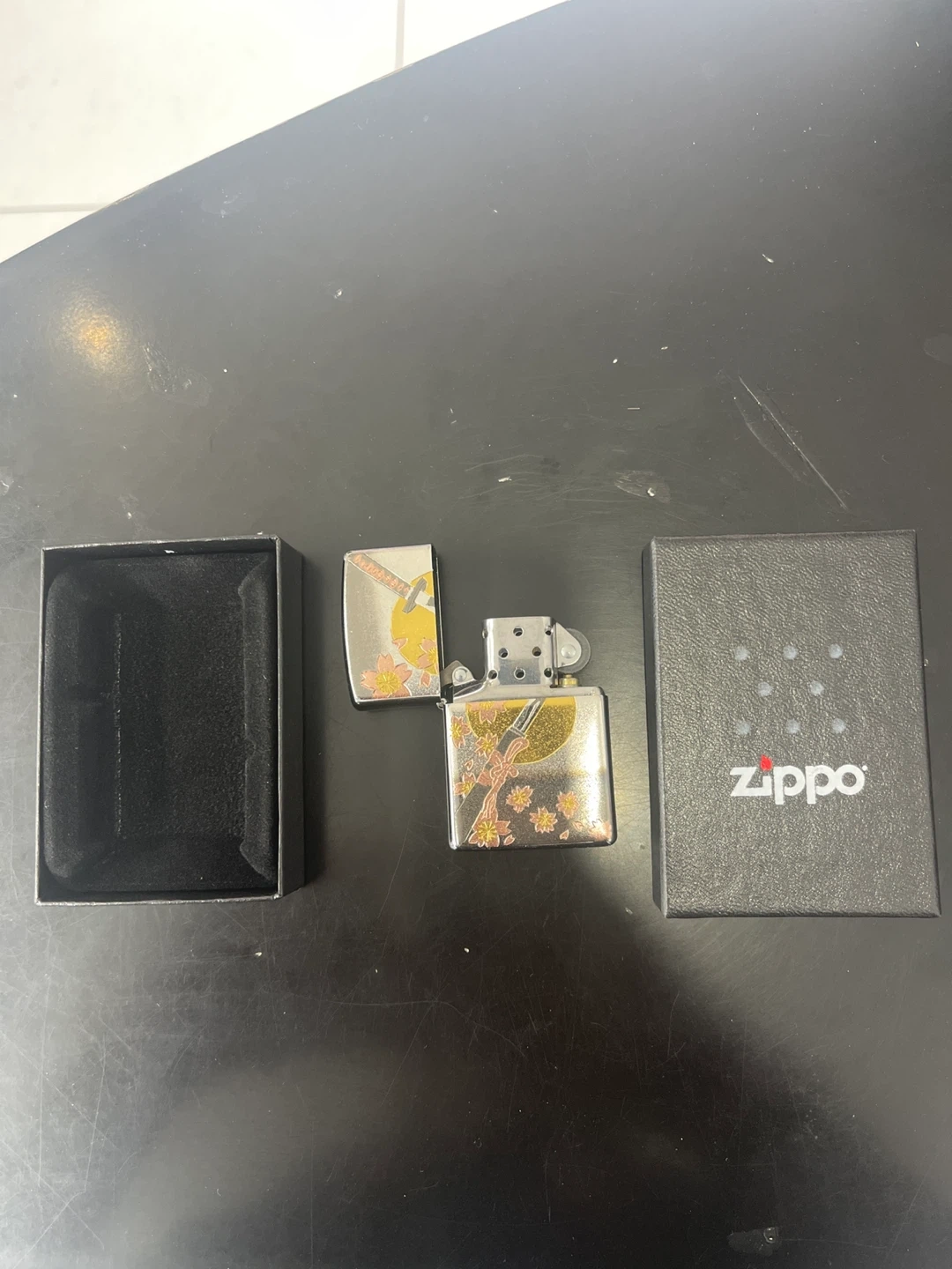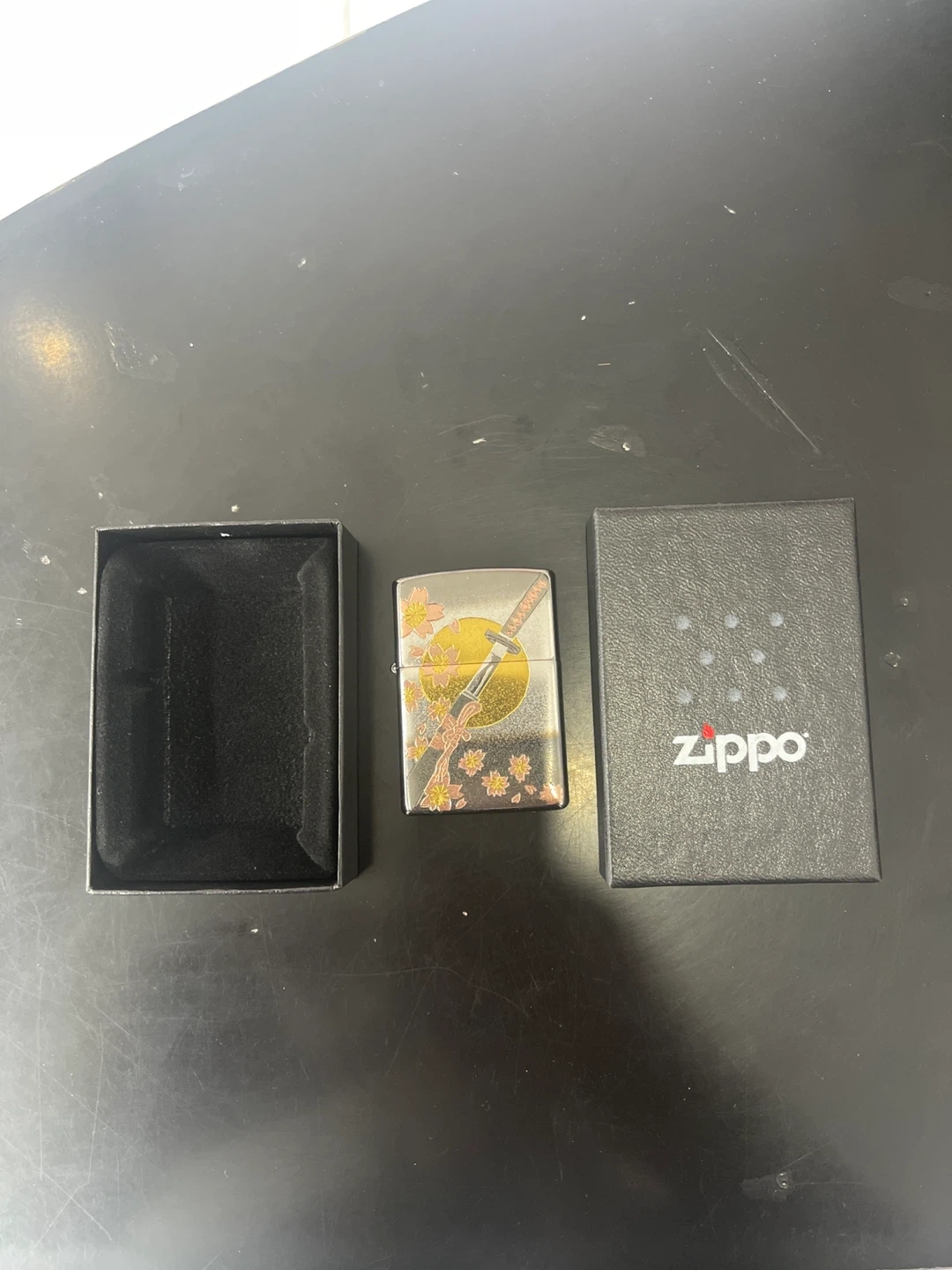 This Zippo lighter features a detailed design of cherry blossoms and a sword. It includes the original Zippo box. This lighter showcases Japanese-inspired artistry. It's ideal for collectors or anyone who appreciates unique designs!