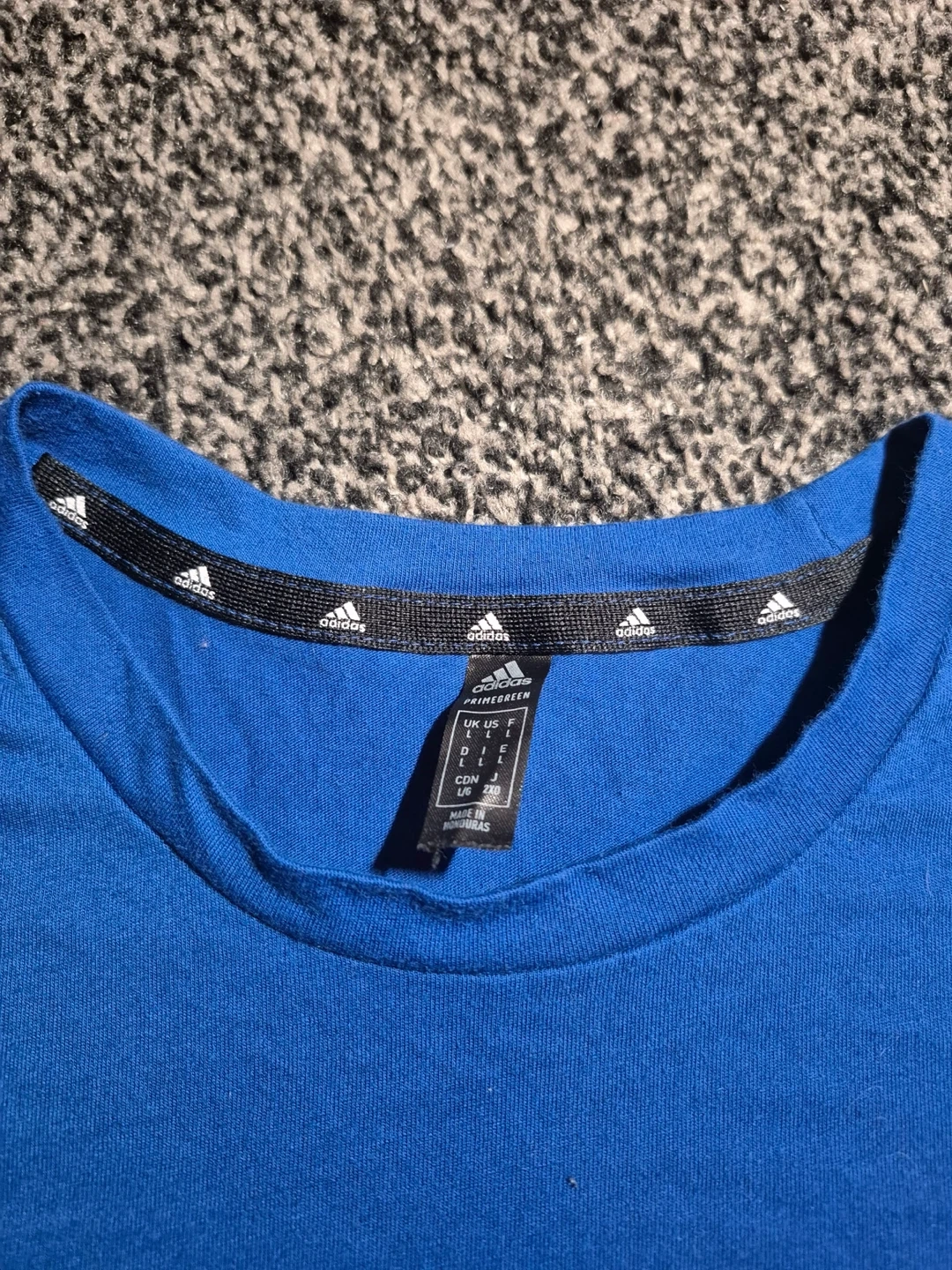 Adidas prime green T-shirt in a vibrant blue colour, size large. It's in great condition and ready for a new owner! Used 1-2 times only! Great for casual wear or for athletic wear!