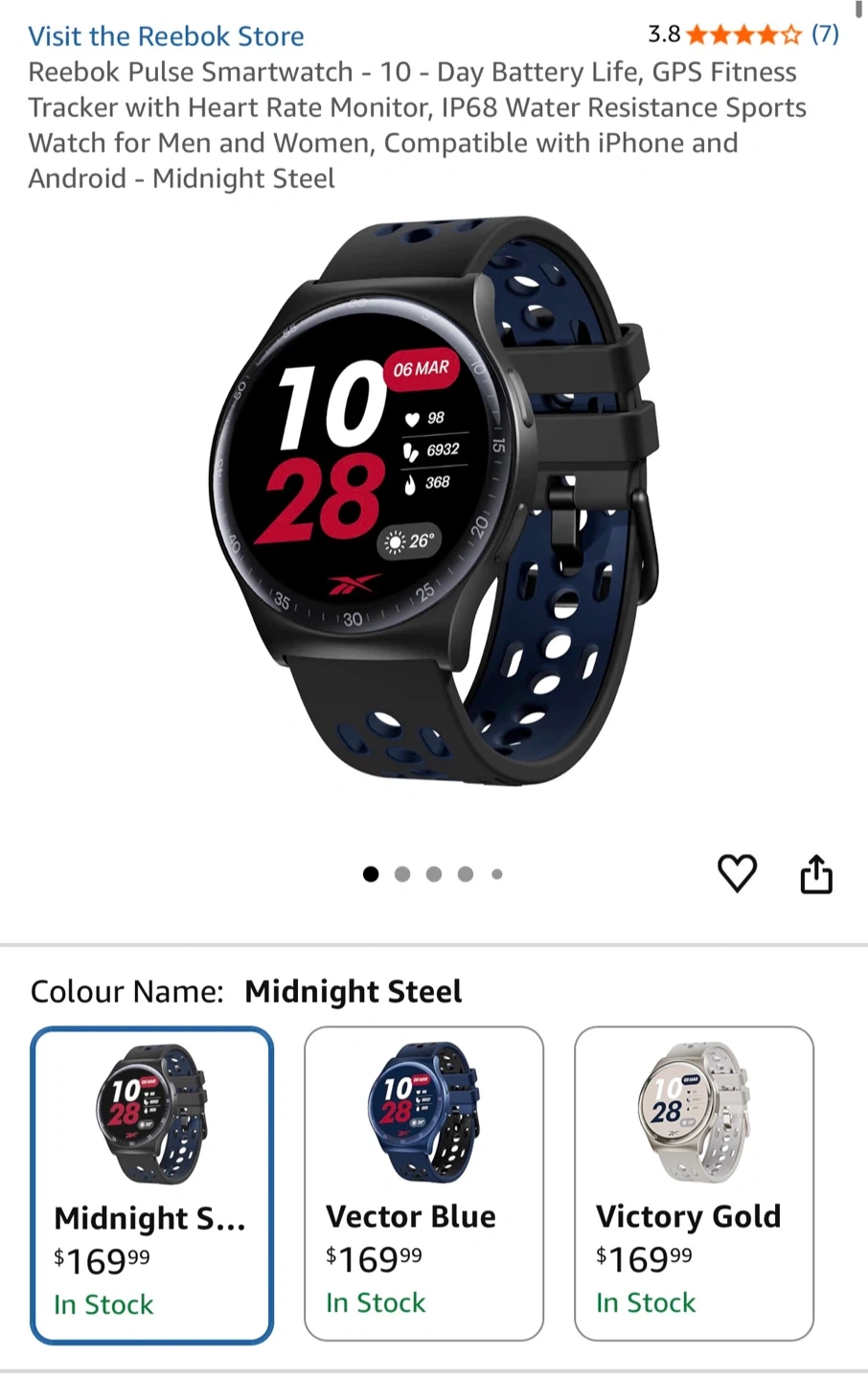 This Reebok Pulse Smartwatch offers 10-day battery life and GPS fitness tracking. It has a heart rate monitor and IP68 water resistance. It's compatible with iPhone and Android devices.
