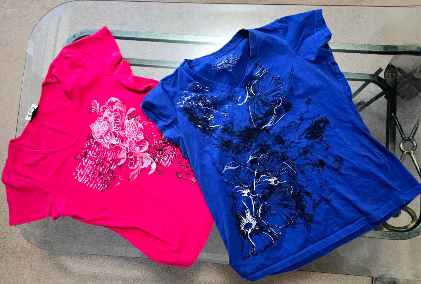 Style: One bright pink tee with a floral/script graphic, and one royal blue v-neck tee with a sketch floral design.