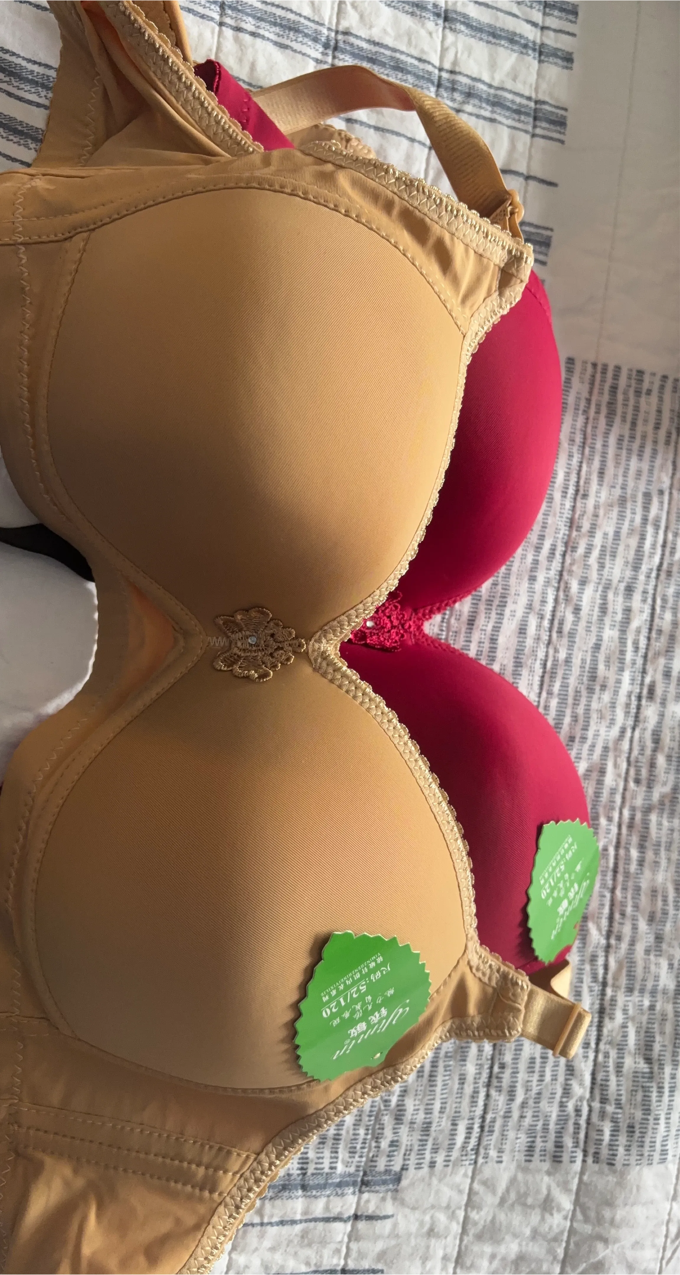 Jimin bra in beige and red. Features a floral accent with rhinestones. Size 52/120. I believe it like a 36 D