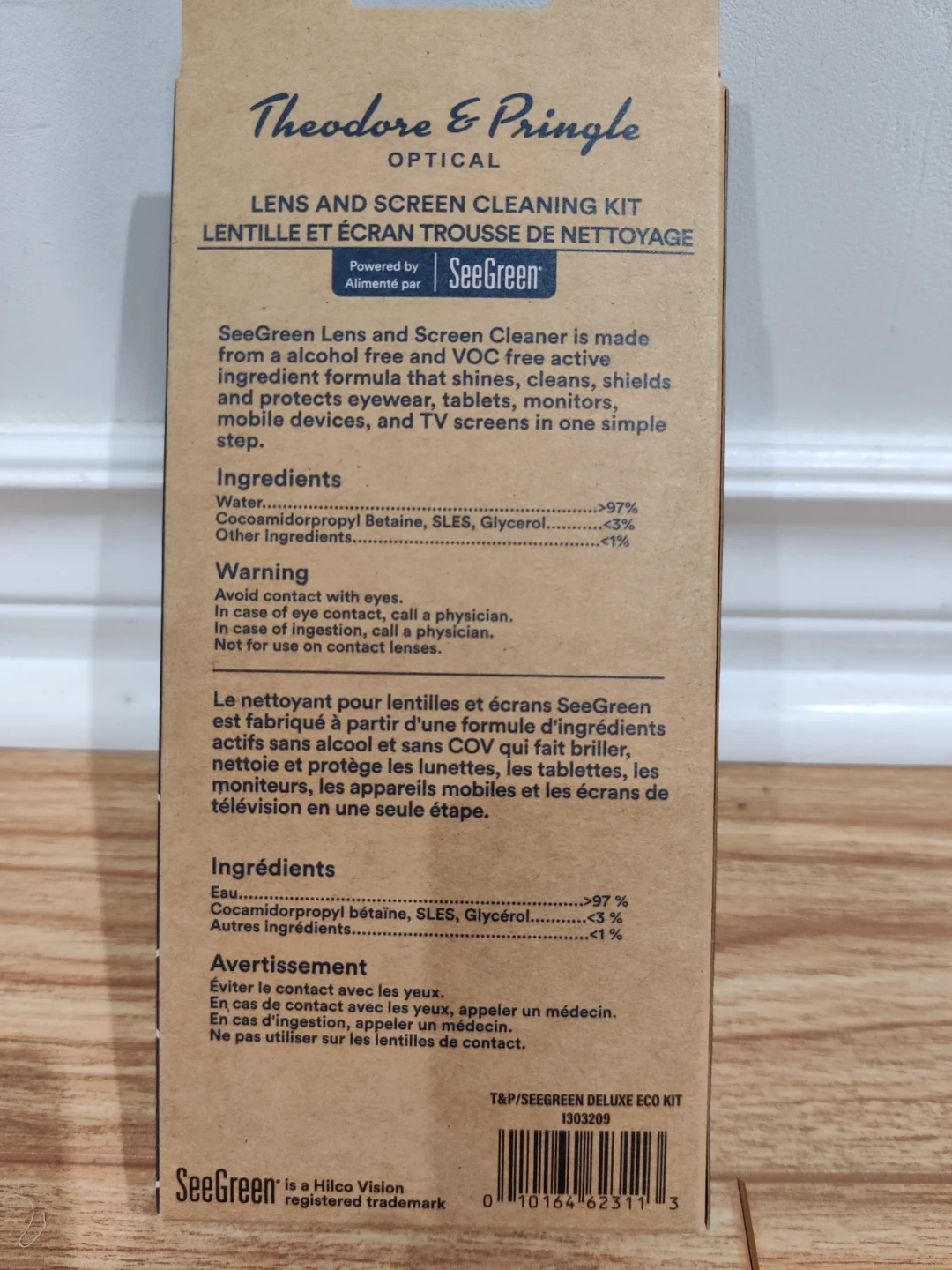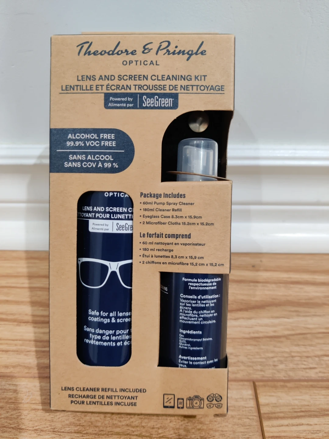Keep your lenses and screens sparkling clean with this Theodore & Pringle Optical Lens and Screen Cleaning Kit! It's powered by SeeGreen and is alcohol and VOC free. The package includes: