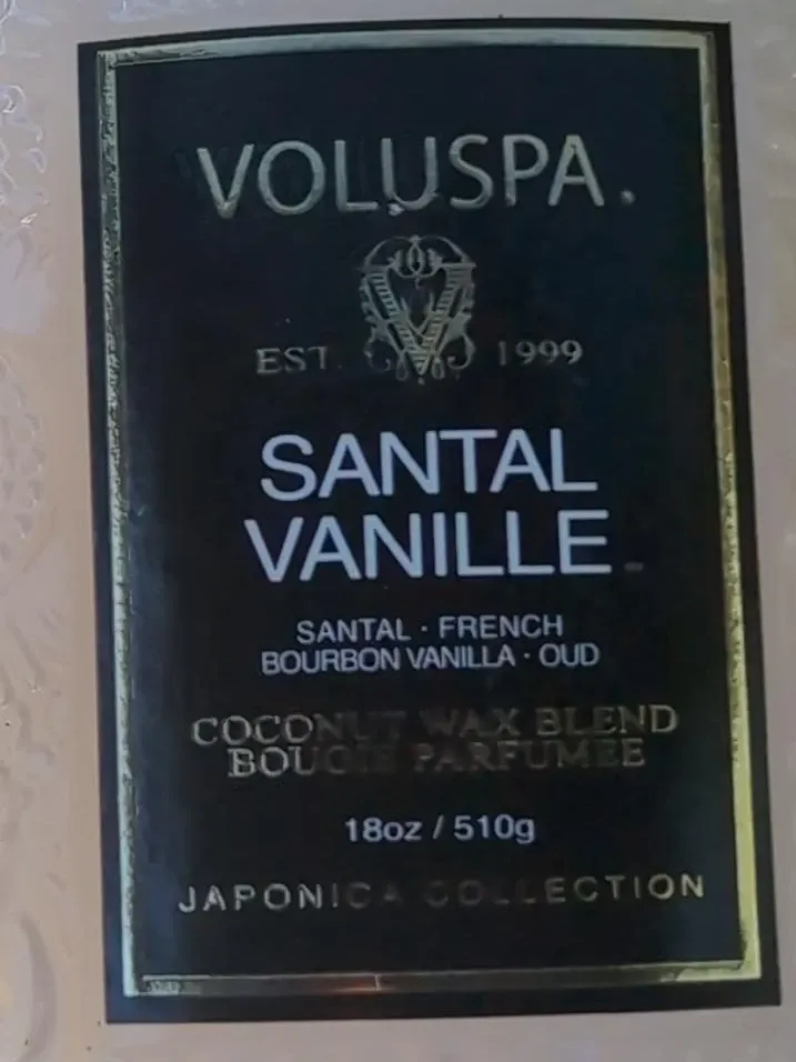 Voluspa Santal Vanille candle from the Japonica Collection. Coconut wax blend. 18oz / 510g. Santal, French Bourbon Vanilla, Oud scent notes. It's beautifully fragranced!