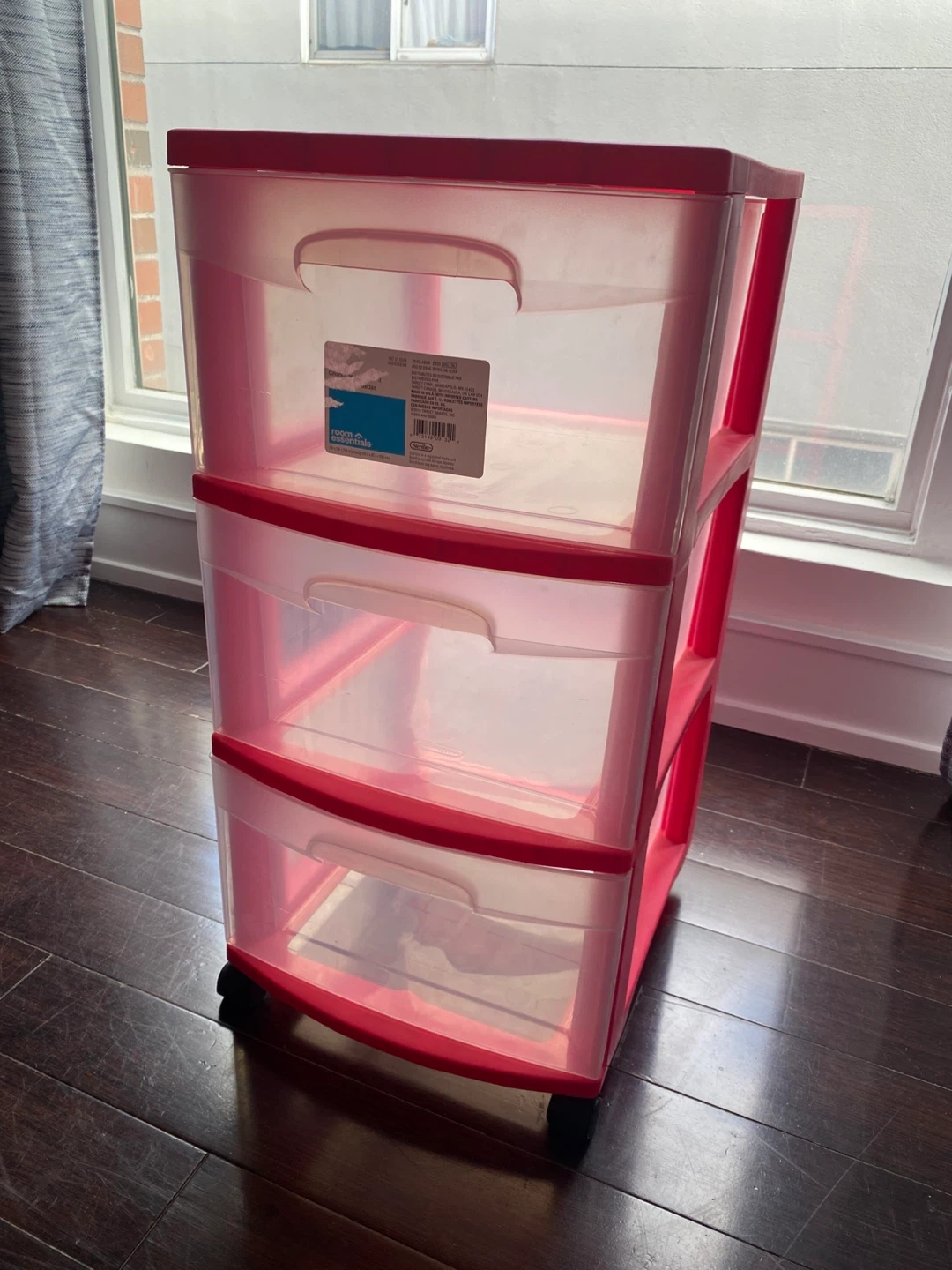This plastic storage cart comes with three clear drawers. It has a red frame and a red top. The drawers are easy to slide in and out. Its compact size makes it great for small spaces.