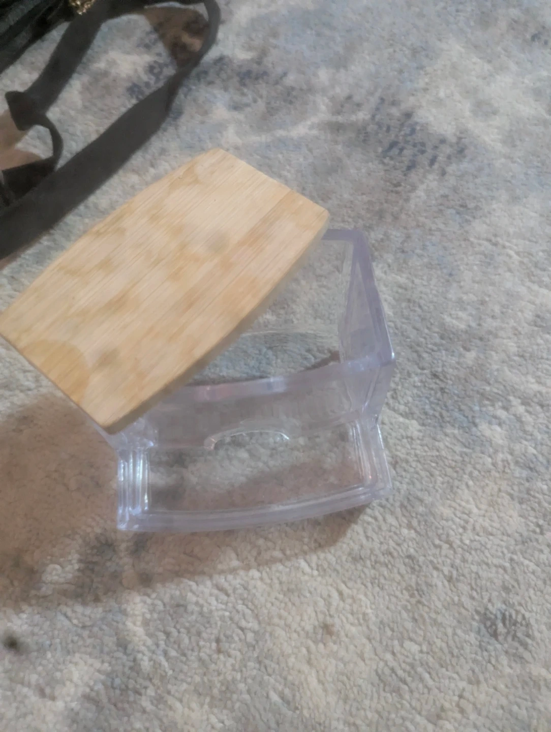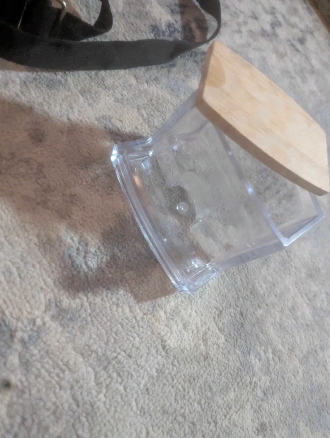 This clear plastic container comes with a light-coloured wooden lid. It's a handy little storage piece for small items. The base is made of clear plastic with a curved bottom edge.