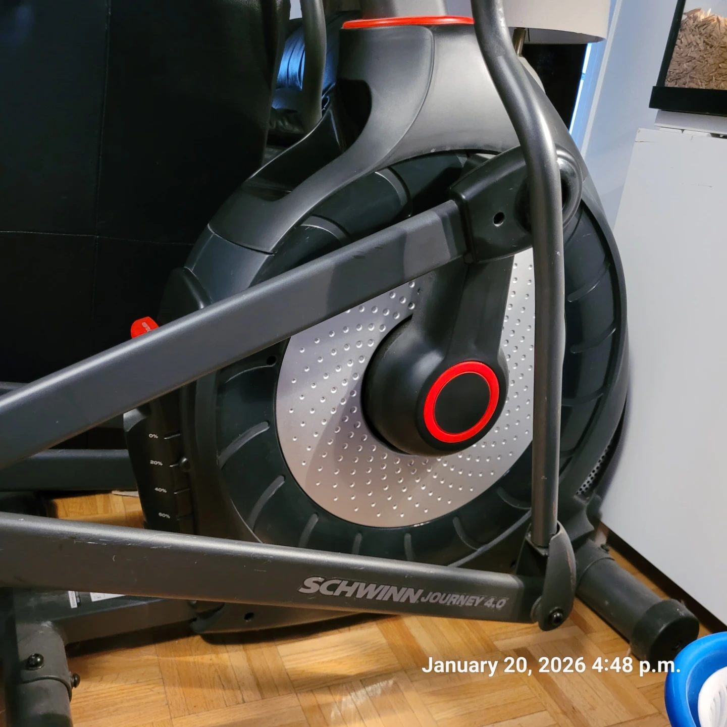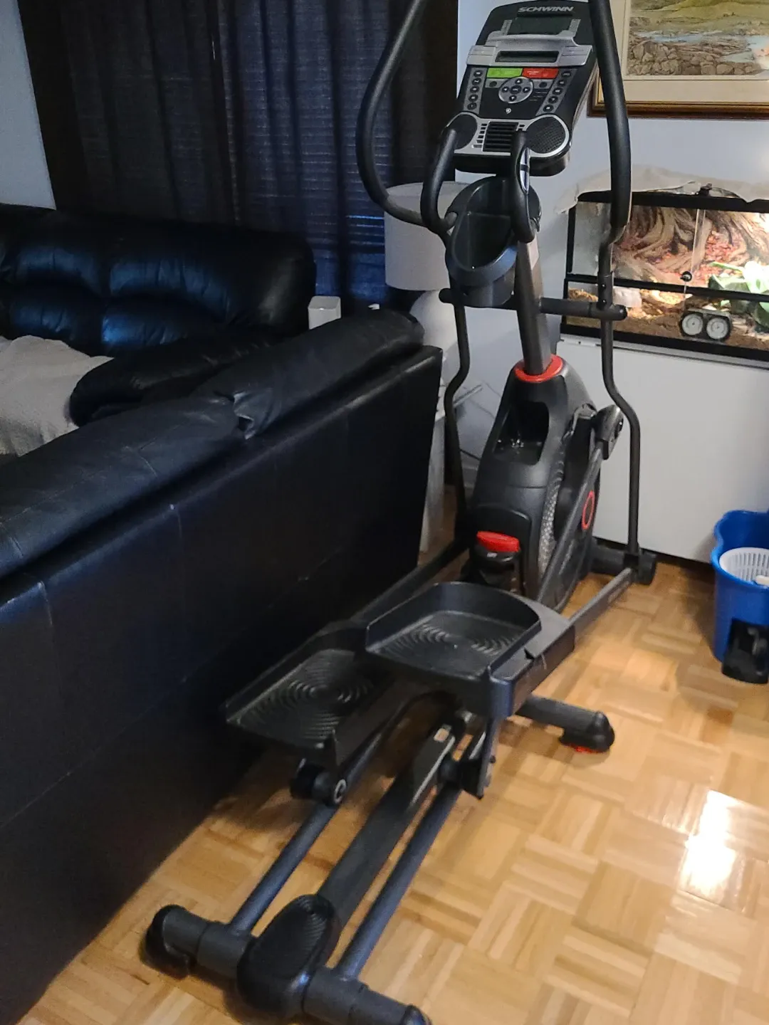 Get your sweat on with this Schwinn elliptical machine! It's in great shape and ready for a new workout buddy. Features include adjustable resistance and various programs to help you reach your fitness goals. Fan setting to cool you off while working out! Original price $1800. Comes with power plug. Some wear on foot pedals.