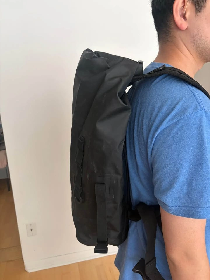 Roll-top waterproof design with 1 zipper. Great for kayaking, boating, beach, camping. Large capacity (approx. 30L). Adjustable backpack straps. Good condition. Cash only. Pickup location: Adelaide st East & Sherborne st.