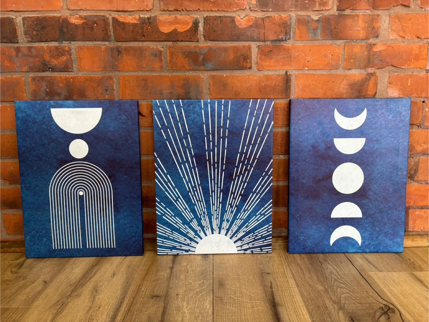 Set of three blue canvas wall art pieces with abstract designs. Each canvas features a deep blue background with white line art. They're perfect for adding a modern, minimalist touch to your living space.