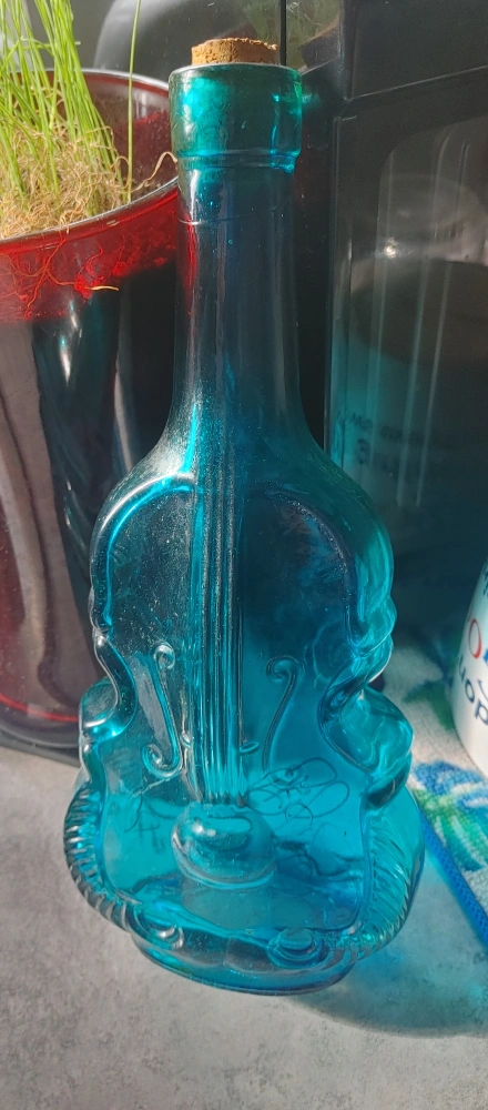 Here's a unique decorative piece! It's a blue glass bottle shaped like a violin, complete with a cork stopper. It would make a lovely addition to any collection or as a quirky home accent