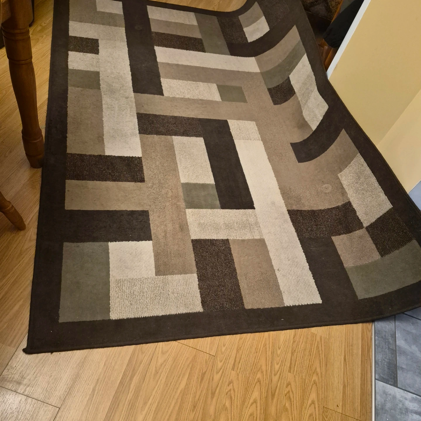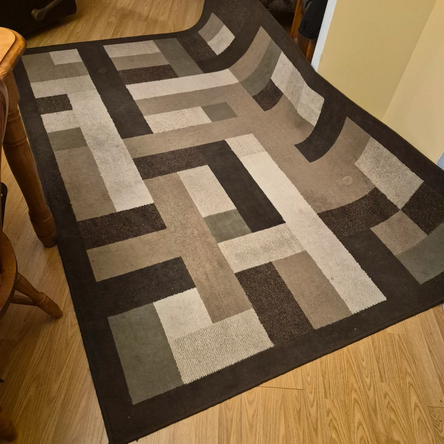 Brown and beige geometric patterned area rug. Adds a modern touch to any room. Suitable for living areas or bedrooms. Has been in dining room. Low traffic area. Pick up.