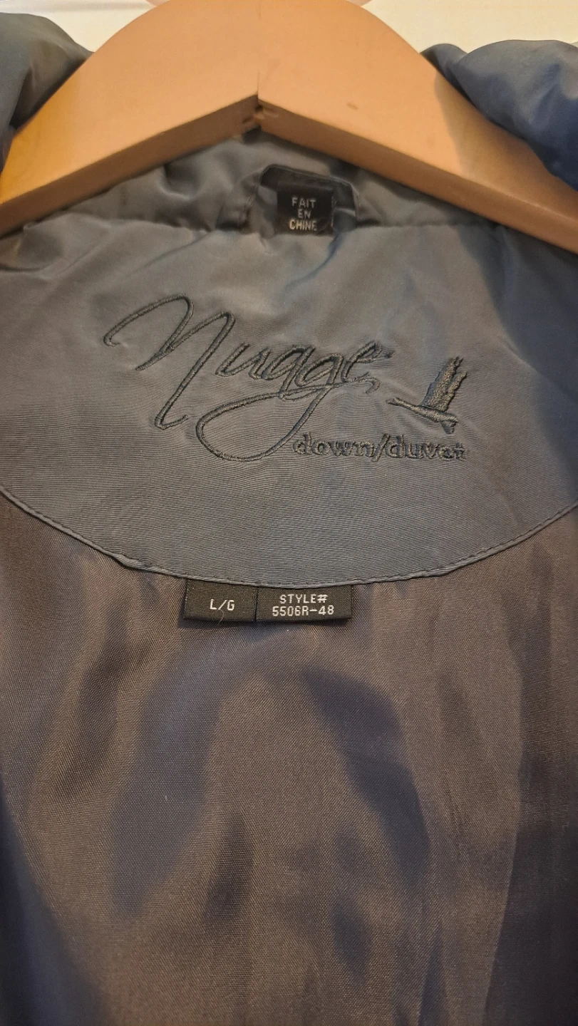 Warm grey Nugget Down puffer long coat. Features a detachable fur-trimmed hood and full button and zipper closure. Side pockets with zippers. Size L/G.