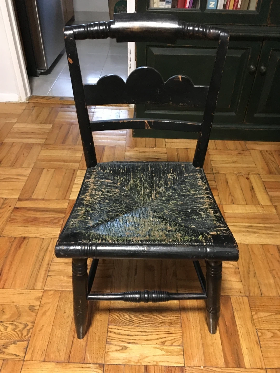 Selling an antique black wooden chair. It shows signs of wear and use, adding to its vintage charm. Perfect for adding a unique touch to your home!