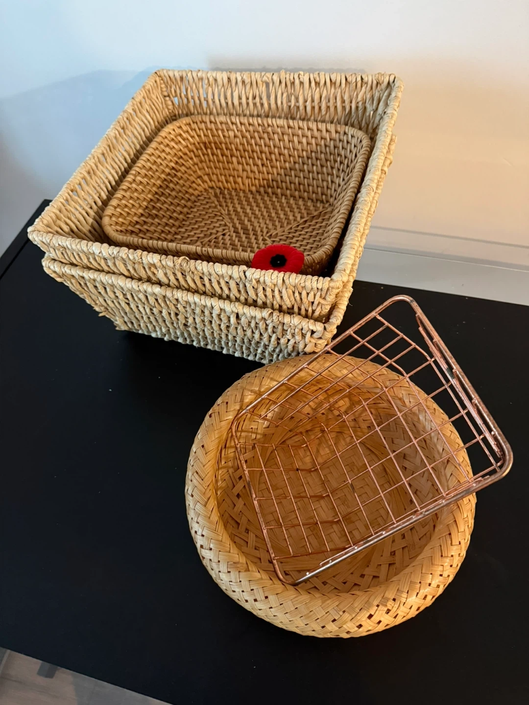 This set includes four natural woven baskets and one rose gold wire basket.