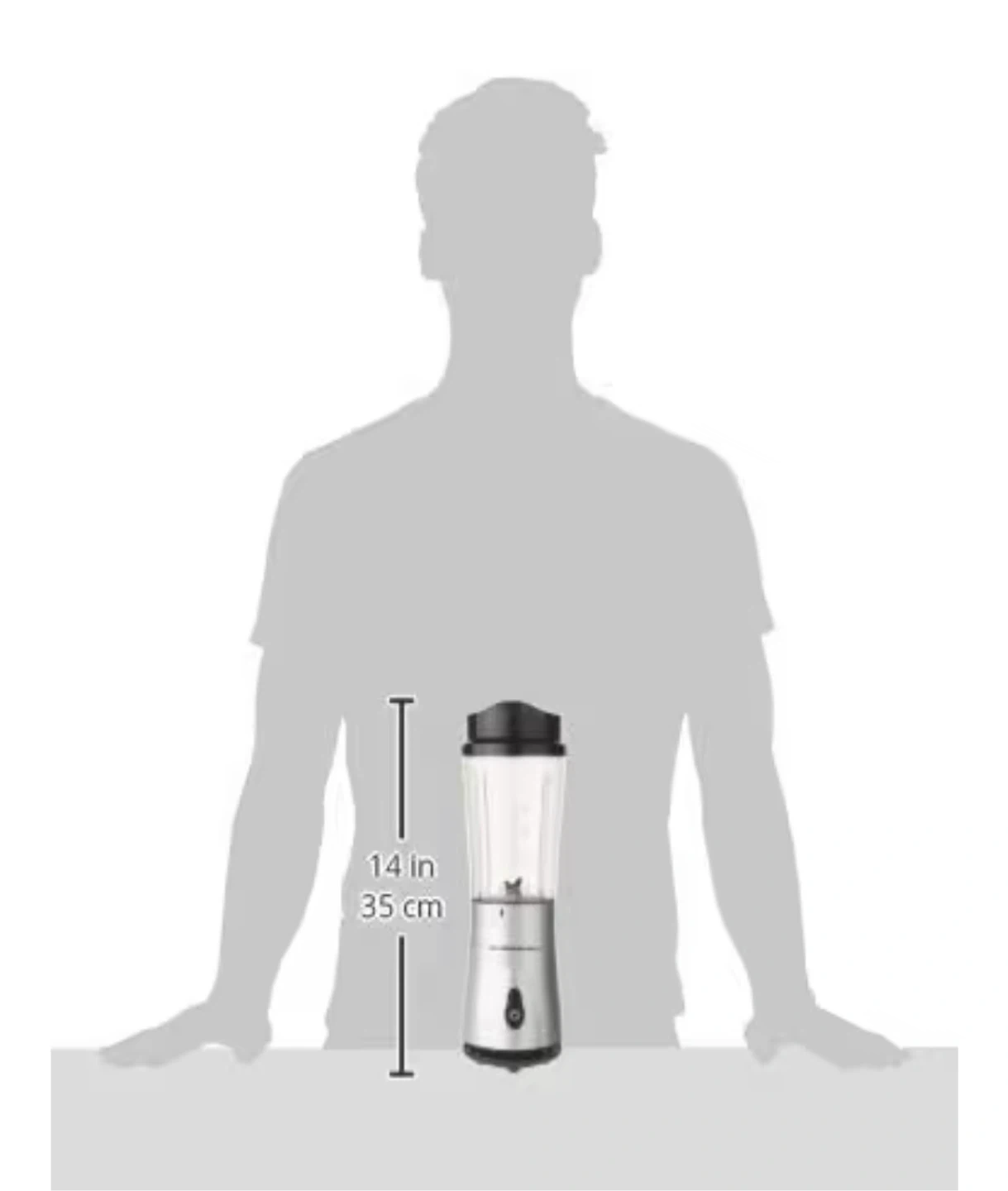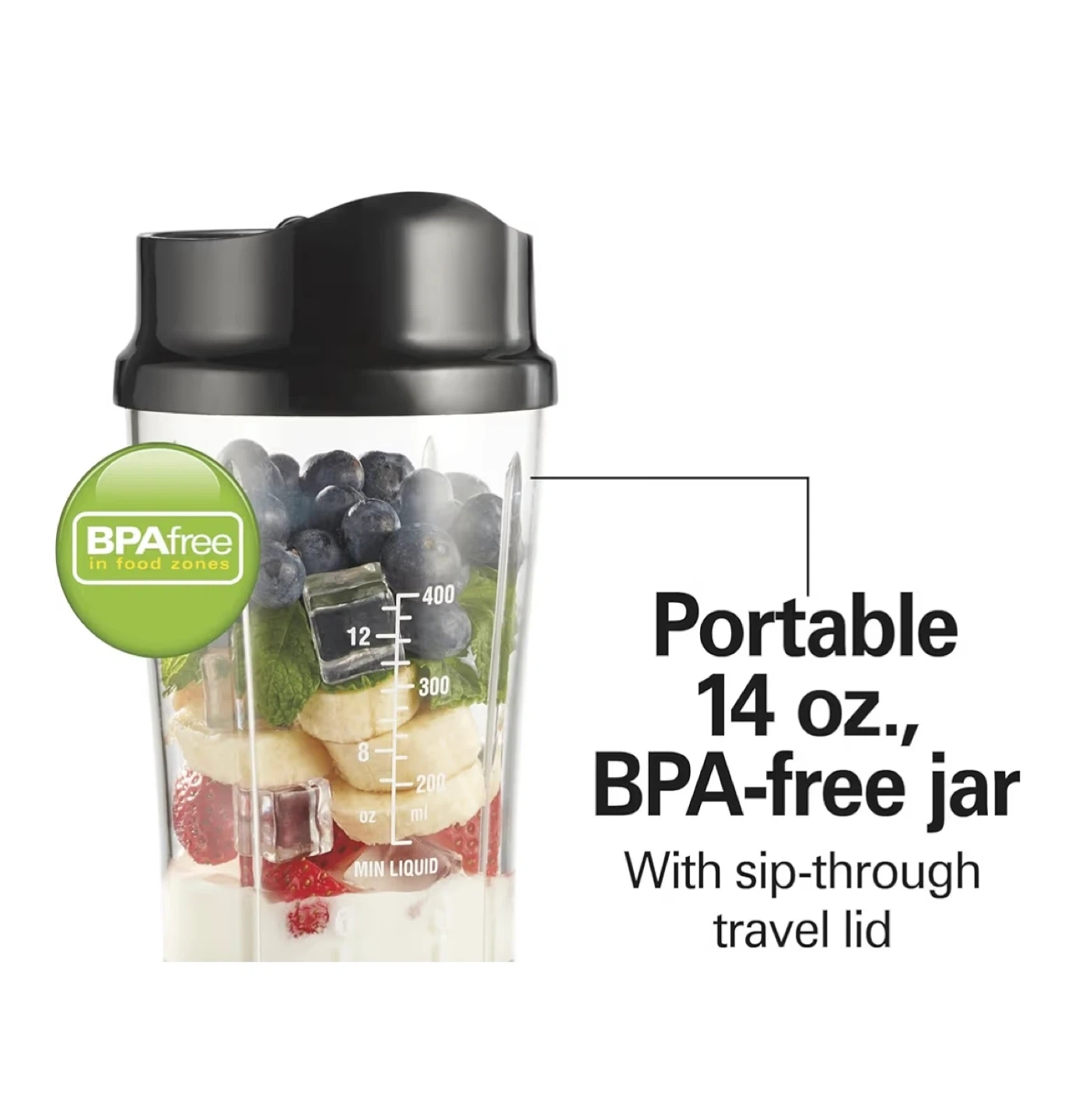 This Hamilton Beach personal blender is perfect for making smoothies and shakes on the go! It comes with a 14 oz, BPA-free jar and a sip-through travel lid. The compact size makes it easy to store and use.